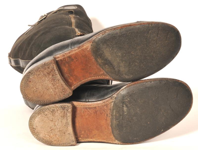 A super pair of the high quality flyers issued boots that were an ingenious design from the brain of MI9 escape specialist Christopher Clayton Hutton, responsible for so many allied escape tools and equipment. The fleece lined uppers could be cut away on landing and the boots would then become civilian looking shoes . A small pen knife was concealed inside a pocket within one of the fleece linings (Pen knife minus ). Broad arrow marked zip denotes manufacture from 1943 onwards. ( Marked Lightning to reverse )