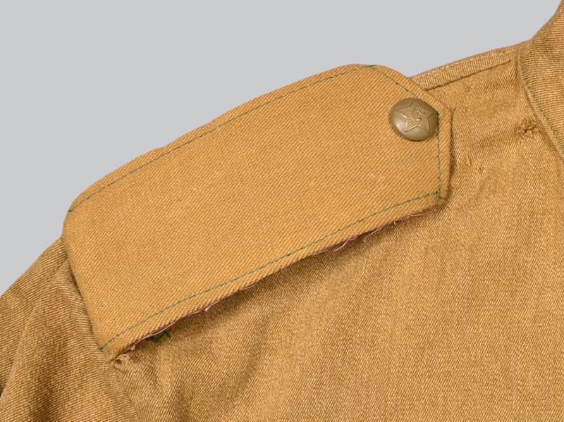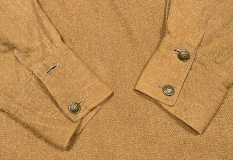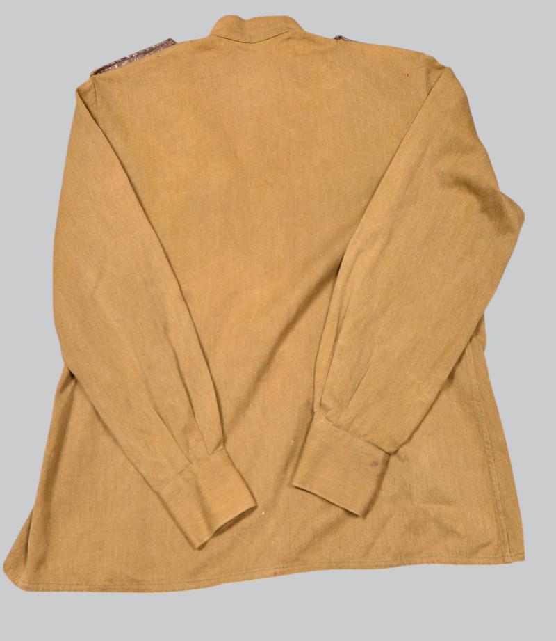 The size is a good large with some minor pulls and service stains to the fabric with one button absent . The shirt has a pair of oil cloth backed soldiers shoulder boards .