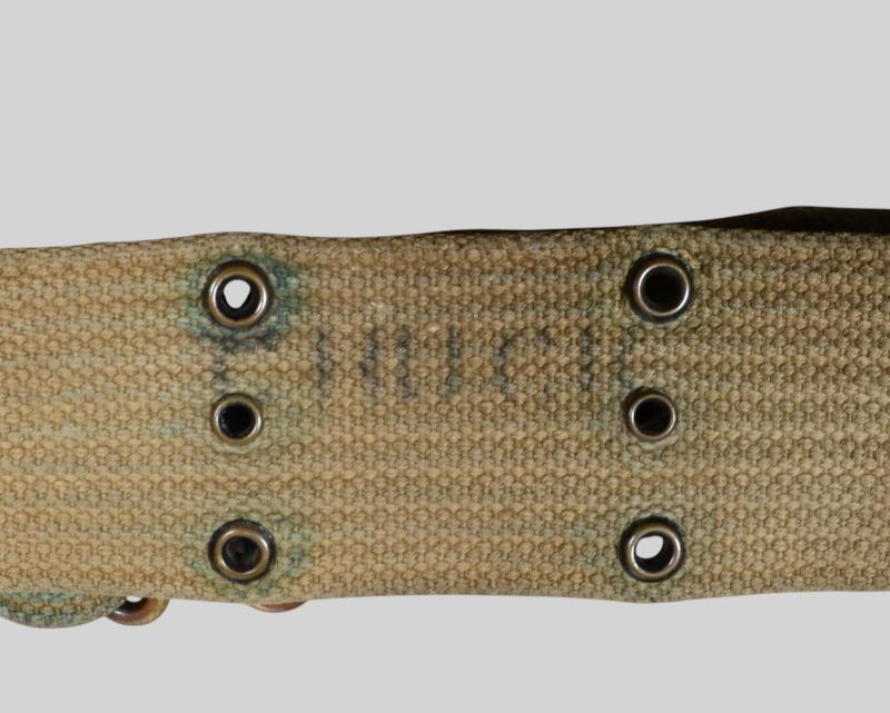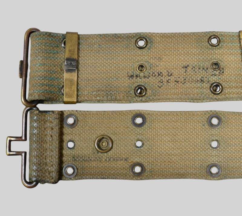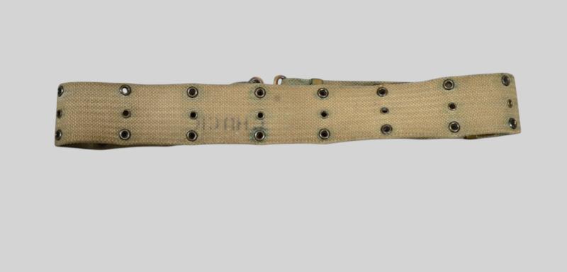A well used combat belt with lots of been there character . There are some ink names and ID and US stencils & faint maker marks . All complete and undamaged .