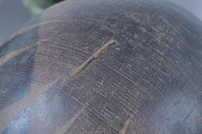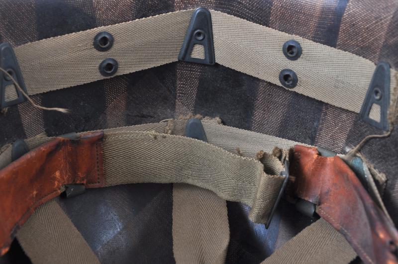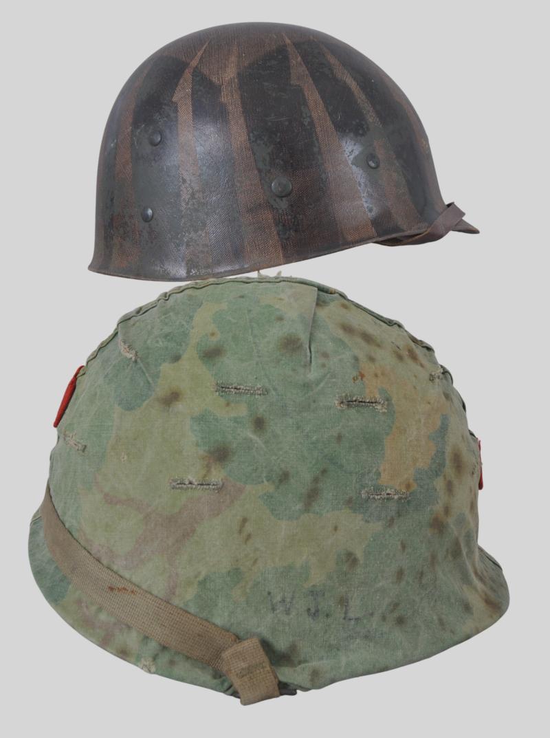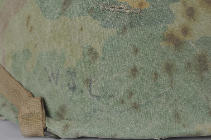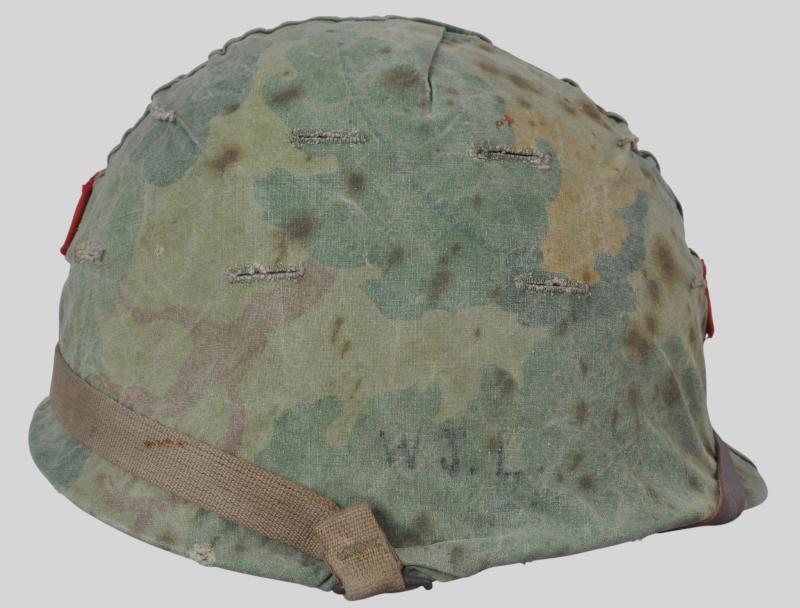 This helmet exudes battle wear with correlating age fading to cover that has clearly always been on this helmet shell. To the front & back of the Mitchell camouflage cover is a red tactical insignia patch with underside of one tongue of the cover having a label that reads 'COVER,HELMET, CAMOUFLAGE MARINE CORPS SUPPLY ACTIVITY ' with a series of batch numbers. The name 'Lightner' is handwritten to the underside of another tongue with 'W.J.L' written onto each side of the cover. Helmet shell is a rear seam swivel bales example. Liner is a wartime Westinghouse made example some of these were still in use when the Vietnam war started. Leather chinstrap intact.