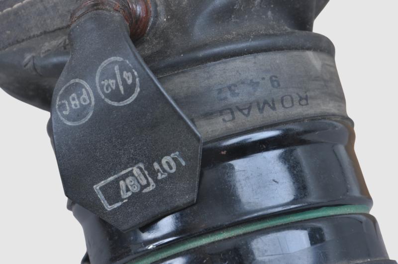 Civilian respirator for Asthma sufferers differing from normal issues by having the extra noseflap for easier breathing to front. Excellent supple rubber dated 1942 with undamaged card box.