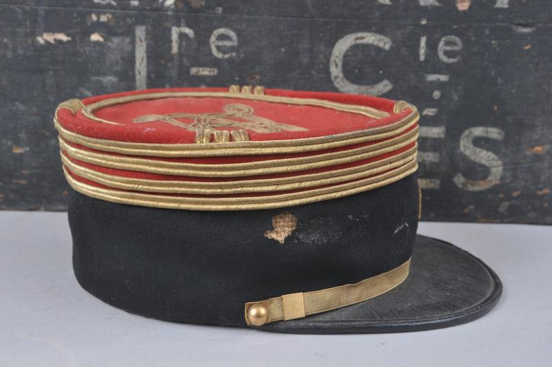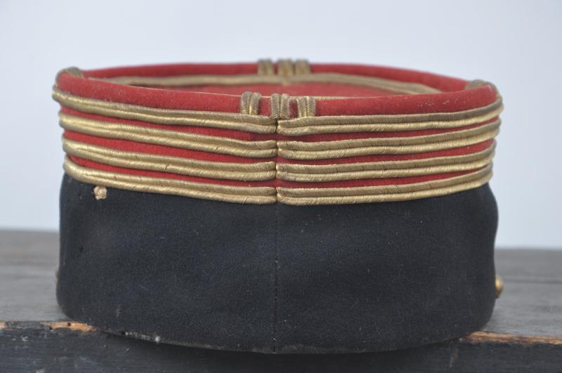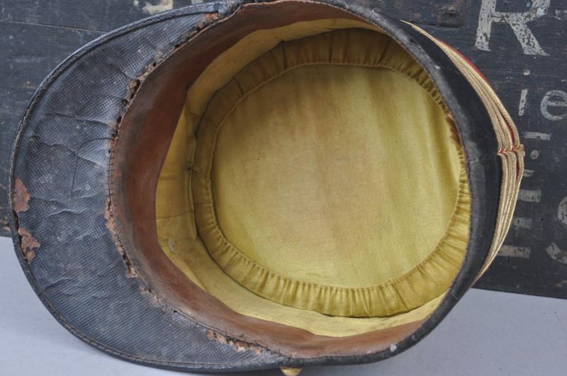 This early prewar kepi is typical of those still being worn in 1914 during the opening stages of WW1. Of high quality private purchase with red woollen body & early style Hungarian knot to top for officer rank. Four gold braids signify this commanders rank of Colonel. Interior has leather sweatband perforated for ventilation , another quality feature supplied at the officers expense. Coming with 'footlocker' personal box also marked to the 108th regiment & having belonged to the same officer.