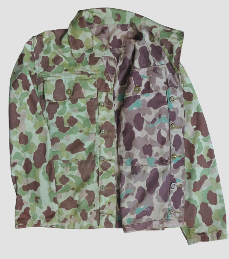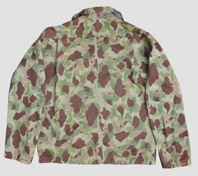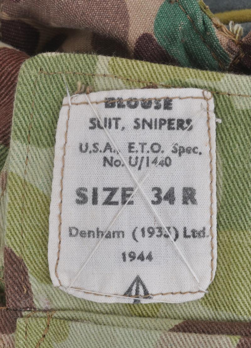 Rare camouflage smock as worn in Normandy by members of the US 2nd Armoured Division. This was part of the 'Suit, Snipers, U.S.A, E.T.O' as stated on the label & manufactured by 'Denham (1933) Ltd' in 1944. Made in the UK for use by American Forces the size is stated as '38R'. Single breasted and manufactured in cotton drill with a double sided 'frogskin' camouflage, printed in a green/summer colour on one side and brown/autumnal colour on the other. Large chest pockets are secured with buttoned flaps (straight) and with button adjustable cuffs. This is fully reversible with pockets and buttons on both sides . This example is in excellent condition and retains all of its original buttons . No damage , rips or tears & a very rare smock.