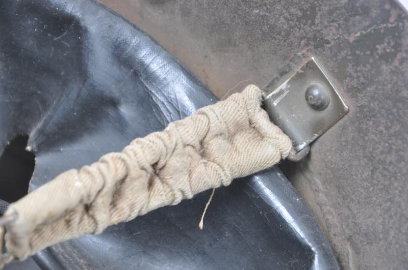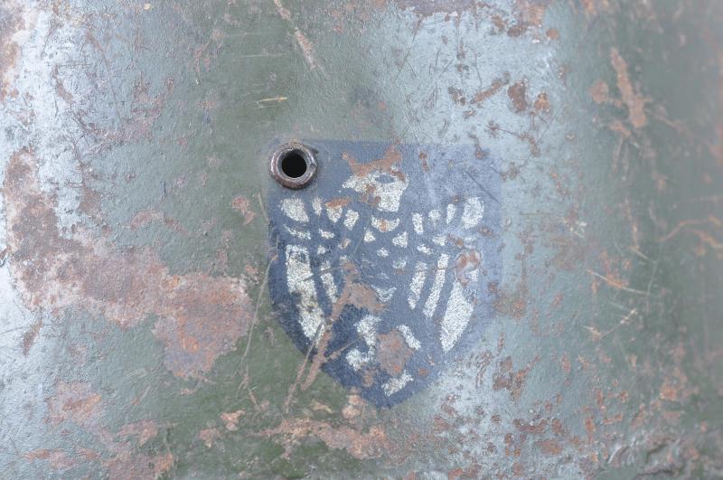 Very crude in its construction it is of heavy steel welded together to make the 'coalscuttle' type shape with decals handpainted on either side representative of the national tricolour shield & eagle /swastika emblem. Overpainted in dark green it has a first issue 1939 dated oval dome padded liner system to interior with web chinstrap. Having been shed stored for many years it has some splashes of white paint to the interior which we have made no attempt to remove.