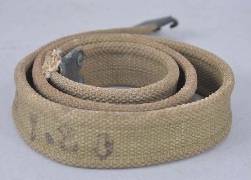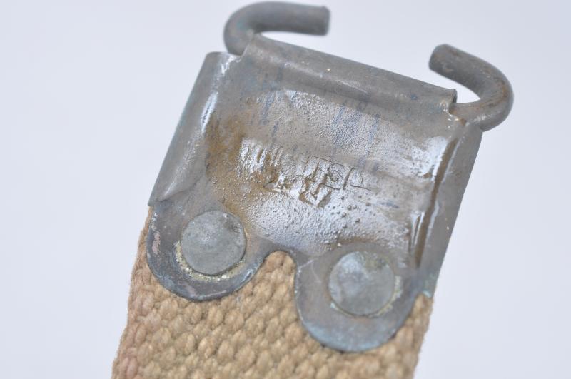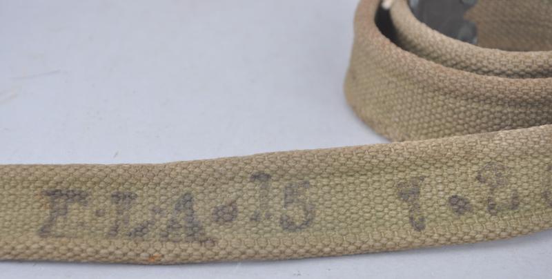 WW1 British SMLE rifle sling having 1917 date & maker to both brass tabs of each end. Also has ink stamped unit markings on one side.