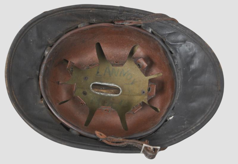 A good condition example it retains a good proportion of its brown paint with officers leather chinstrap. Interior liner system remains good with the added bonus of the handwritten & notable name of 'LANNOY' .