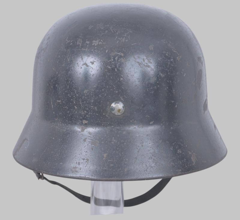 The Q ( Quist ) produced helmet retains a very high proportion of its original factory blue paint with scuffs & chips to shell indicative of heavy service use. Both decals remain present with correlating age & wear to both. All three of its liner pins remain totally undisturbed having matching paint to exterior & unbent arms internally. Examination of the reinforced aluminium band ascertains a 1938 date with 'Q64' '767' lot number to underside of rear skirt. Upon close examination the very faint remains of a name can be seen scribbled onto the metal below the lot number. Leather liner size marked '57' with some faint initials visible to the tip of one of the leather fingers. Finally , the totally original chinstrap has a grey painted steel buckle & came on the helmet when acquired.