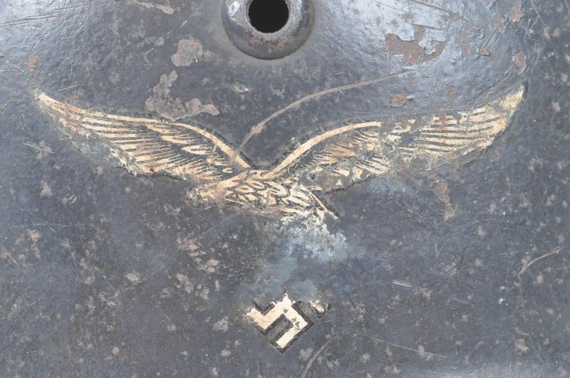 An honest M35 Luftwaffe helmet that has clearly seen life with a flight crew signaller or ground combat unit such as Paratroopers or Field Division troops who absorbed many such support personnel as the size of the Luftwaffe flight arm diminished in 1944.