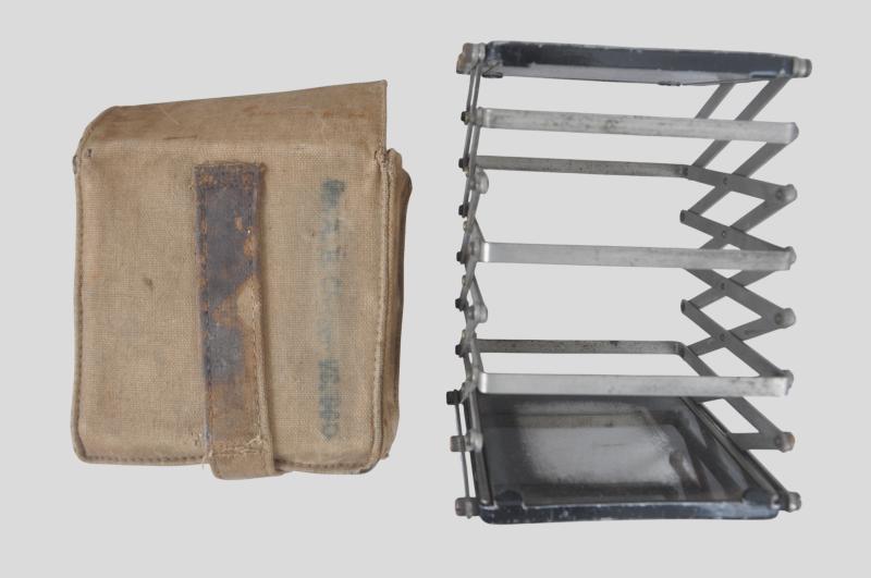 Officers and soldiers were offered a huge range of products some good and many bad . This particular commercial product was a huge success and met with very good sales . The periscope comes with its fitted belt mountable carry pouch in canvas . The device is very good with typical age spotting to the mirrors . The makers trade decal is excellent as is the black japanned finish metalwork .