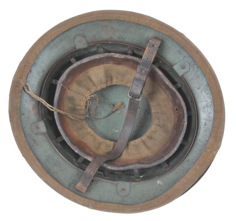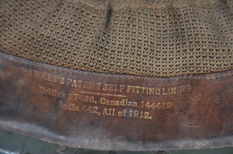 Superb example of a private purchase British officer helmet by the well known Military outfitters 'Hawkes' . Helmet shell is in the early light green typical of early productions. Hawkes provided a number of liner variations this being the four point ' Self Fitting Version'. Cover is a maker specific to Hawkes with leather reinforcing trim to interior . Two holes to front of helmet suggest previous fitment of a cap badge. Leather chinstrap intact.