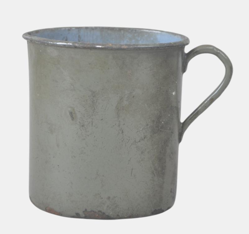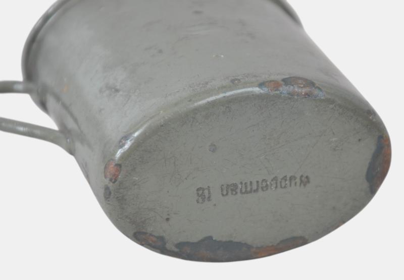 Green enamel drinking cup with marking to bottom 'Wupperman 18'. Blue interior & as used with the field flask.