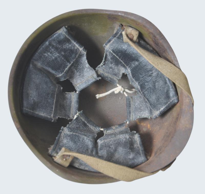 In the typical wartime green of Russian manufacture it is complete with its three pad liner system & also the totally correct web chinstrap arrangement secured with rivet studs . Liner pads are of the distinctive oilcloth material with natural felt strips to the reverse. All pads are still padded. Tightening cord still present. The black rectangular ink stamp gives an undiscernable size & a year of manufacture under this of '43'.