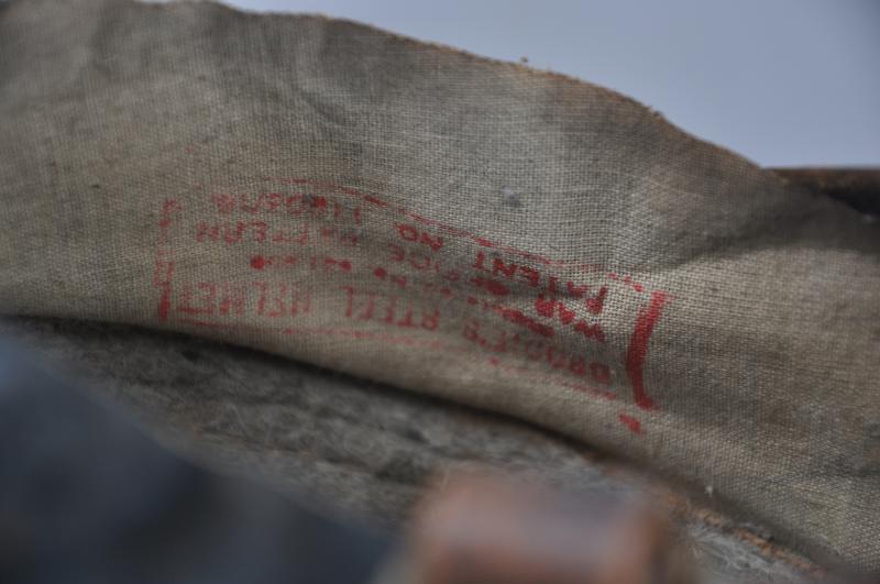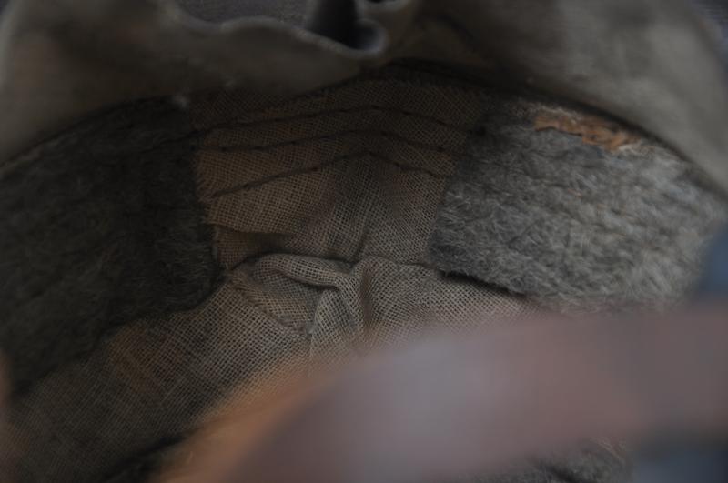 The interior liner still has its drawstrung net with the inside felt crown padding remaining . This is the 1917 pattern with rubber ring present to inside of crown pad.