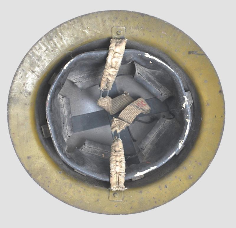 This is a very early issue the helmet being of an early rimless Mk1 pattern these were issued before the MkII became standard issue. Factory painted in a green hued khaki with undisturbed liner bolt to top of helmet. Interior has issue liner with web chinstrap having elasticity remaining.
