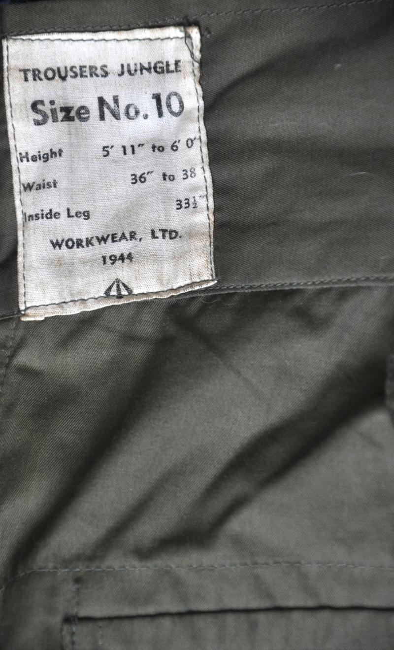 A rare pair of 1944 dated British made jungle green issue trousers with clothing label intact & having very visible 1944 date. War Department inspectors broad arrow & Z code to interior waist.
