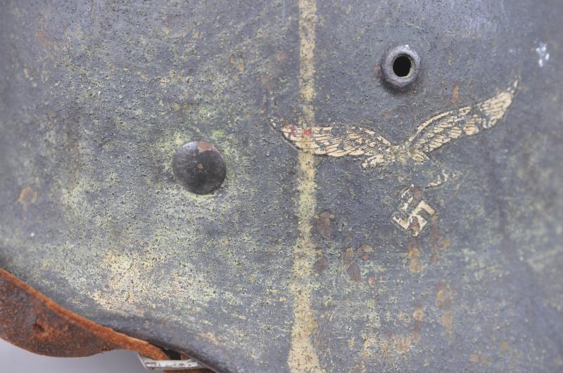 A striking M40 single decal Luftwaffe helmet from a ground combat unit with ad hoc camouflage stripes in trickle effect classic Normandy colours of tan ochre & green. This has been applied over a rough textured dark green paint finish which was painted over its smooth factory applied blue finish before the camouflage. Decal remains largely intact . A small impact dent to the top is indicative of this helmet having seen combat with paint loss in the immediate area . All three liner rivets are original to the helmet showing unbent pins to reverse. Interior marked 'hkp62' which was the mark used by the firm 'Saxon Emaillerwerke' from around the Spring of 1941. The Lot number '357' combined with the aforementioned maker code & size identifies back to a single decal Luftwaffe helmet. Leather liner showing heavy wear. Chinstrap shows very faint traces of markings to reverse of pointed end with grey painted steel buckle.