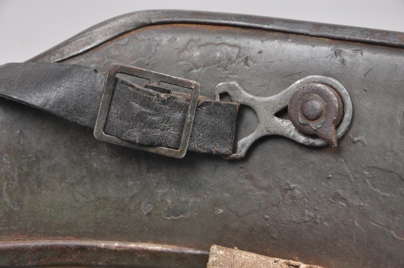 Painted in the classic Western Front tan ochre & brown the apple green factory paint of the helmet has been incorporated into the scheme with tick black dividing lines carefully applied around each segment. This helmet has seen much trench wear with chips & scuffs to the paint scheme of the outer shell & sweat staining to inner pad holders. Still in its original green factory paint to interior the size stamp '68' can be seen to the metal M17 liner band. Chromed off white leather pad holders are intact & all with cushions still inside. All three liner pins undisturbed. Finally the black leather steel buckled chinstrap completes the helmet & has survived in very good condition.