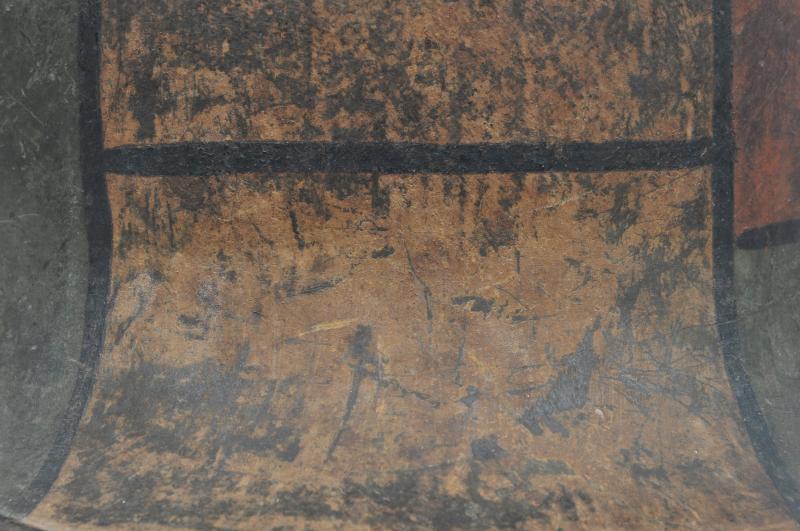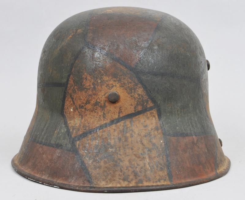 This helmet has been artistically painted using segmented panels of tan ochre , forest green & red brown all applied over the helmets factory apple green paint. Each panel has been bordered with thin black lines these being encountered in all different thicknesses prior to the 1918 Ludendorff standardisation order. All three liner pins are original to the helmet & undisturbed with M16 leather band to interior & all three cushions still present inside each cushion holder. A handwritten name & otehr writing in pencil can be seen to rear underside which may be more dechiperable with close examination . A part of the original chinstrap hangs from left lug.