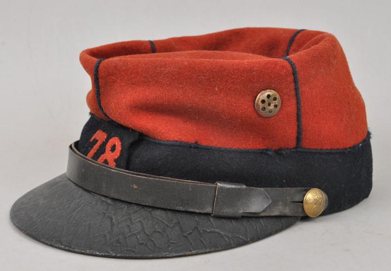 As with most French army attire upon its mobilisation in 1914 this model dated from the 1880s & was soon replaced by 1915 with other forms of less conspicuous headgear which continued to evolve as the war went on. Of red wool cloth with dark blue cord piping the cap band has the number of the regiment crudely stitched on in this case the 78th. When one examines the ad hoc stitching of the patch onto the band it is quite apparent that this is very typical rough soldier applied sewing as is found on most original examples. The circular leather cutout patch in the leather crown has size marking '56' & an inspection stamp which appears to give the date 1899. Chinstrap complete with two tombac c/s buttons bearing the flaming grenade of the infantry. There are some very old obligatory light surface moth nips of the wool in places nothing detracting .