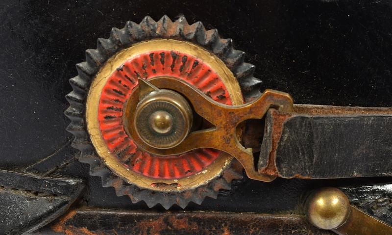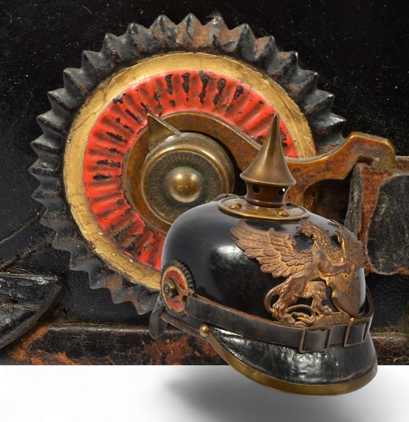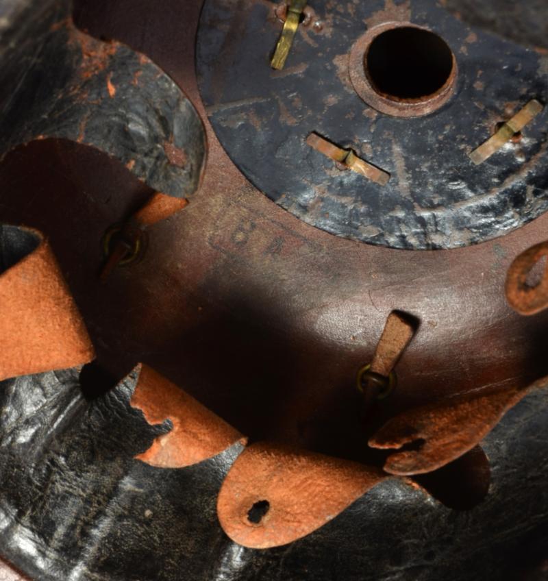 A super and complete bring back Baden mans helmet with very nice patina to all the uncleared brass work . The Baden griffin plate still retains some gilt wash to the lower relief areas . The original chinstrap sits well and hold the twin cockades to each side . Both cockades show a great patina .The inner liner is complete and supple and both original leather wedges hold the plate in place .The leather outer skull is in an excellent sold form and in a good size .
