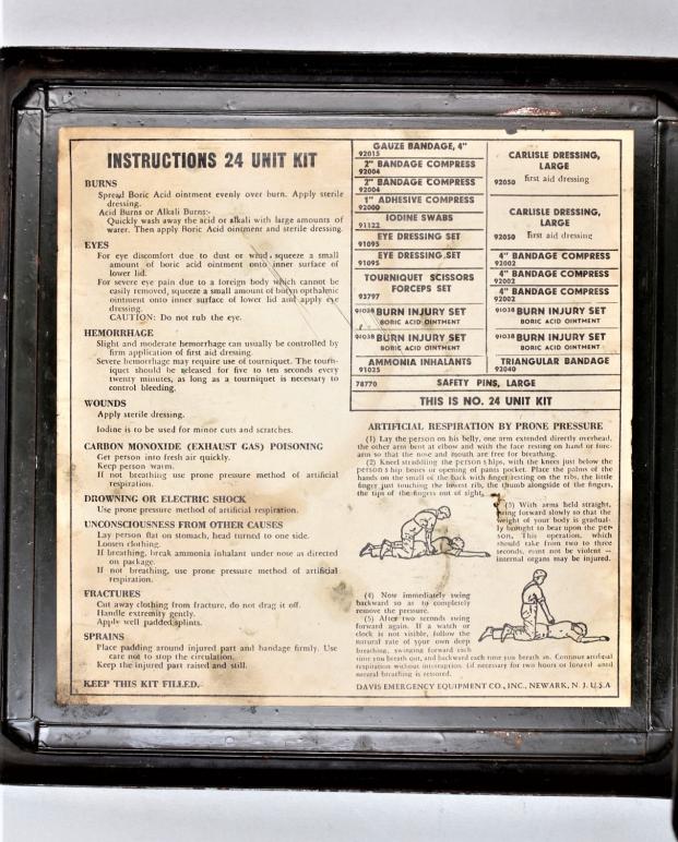 In nice original condition this kit dates from around the 1942-43 period with instructional card still present to underside of lid. Some of its original US Army Medical contents remain as follows :