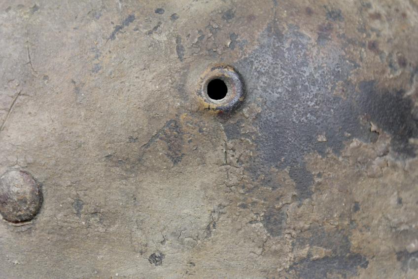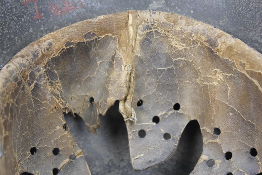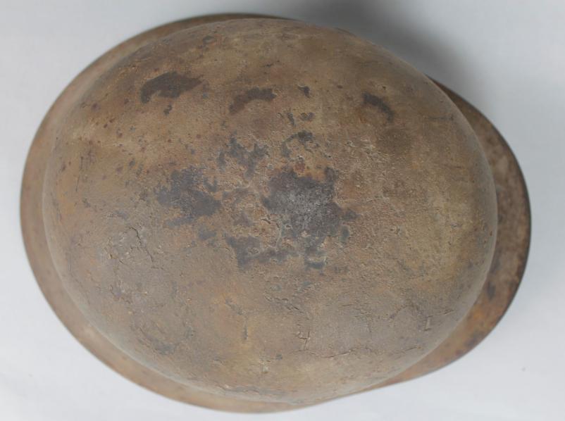 Helmet shows its factory army green to underside & interior with this thick sprayed tan to outside which ahs now aged down to a darker shade . There is much evidence of heavy wear with scuffs & surface age crackling to the paint throughout. Minor rust bleed is coming through from underneath the damaged areas of paint in places with some darker patches I believe caused by damp over the years. Interior of helmet is heavily used with some apparent dark staining in places . All of the liner pins have matching camouflage paint having been with this helmet since wartime.