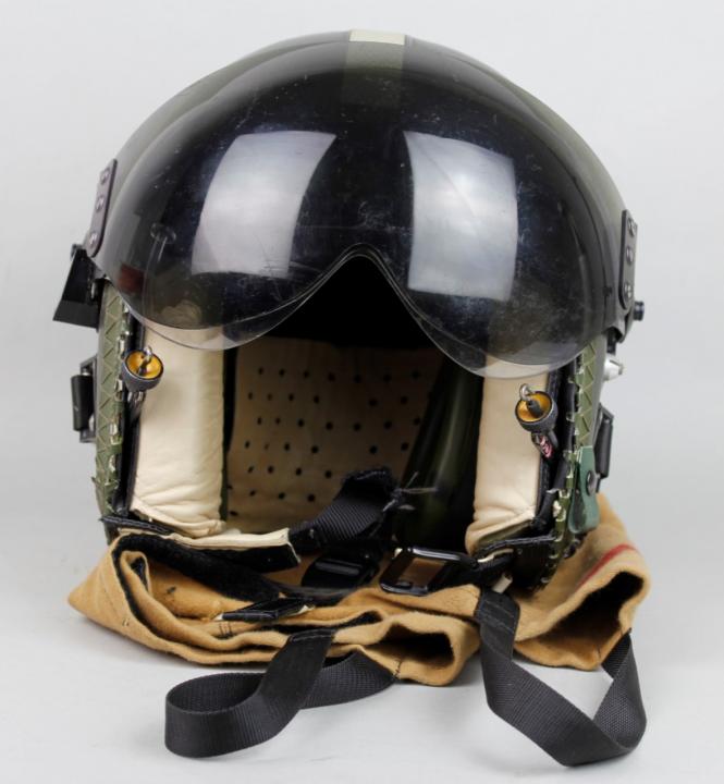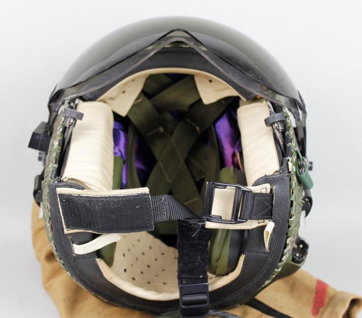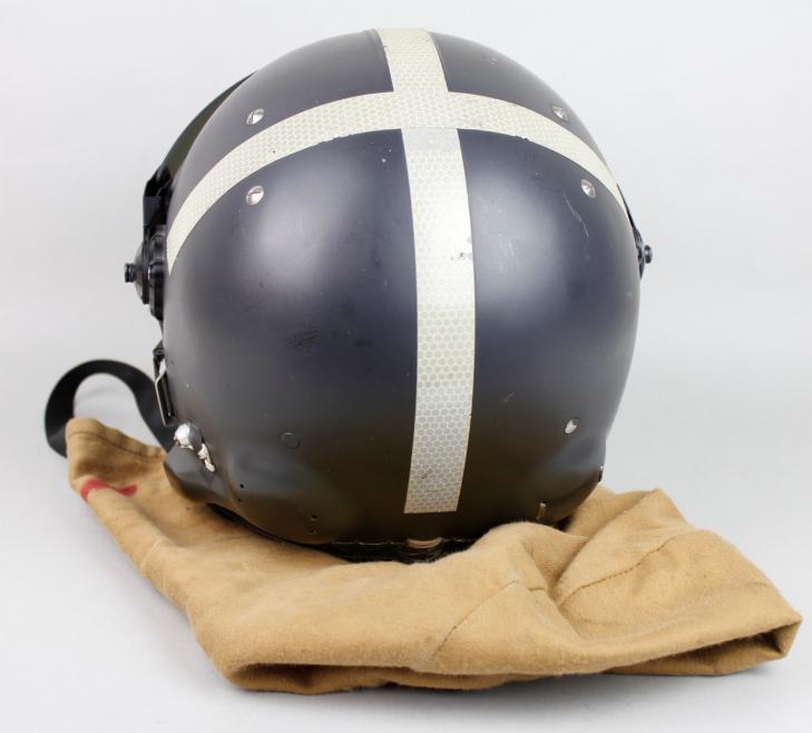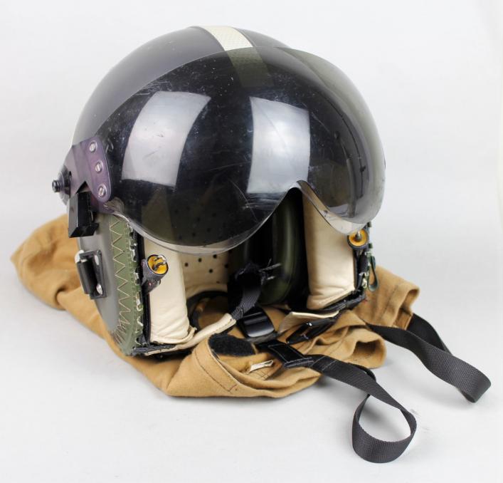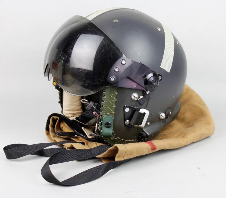 RAF flying helmet from the 4 series ( b or c ) used from late 80s to 90s by fast jet flyers on Hawk , Tornado , Jaguar etc. Excellent display piece comes with RAF 22c marked carry bag.