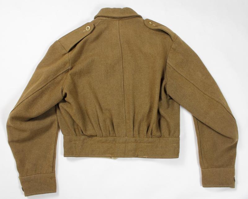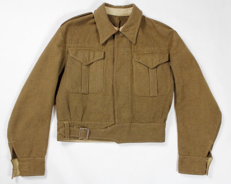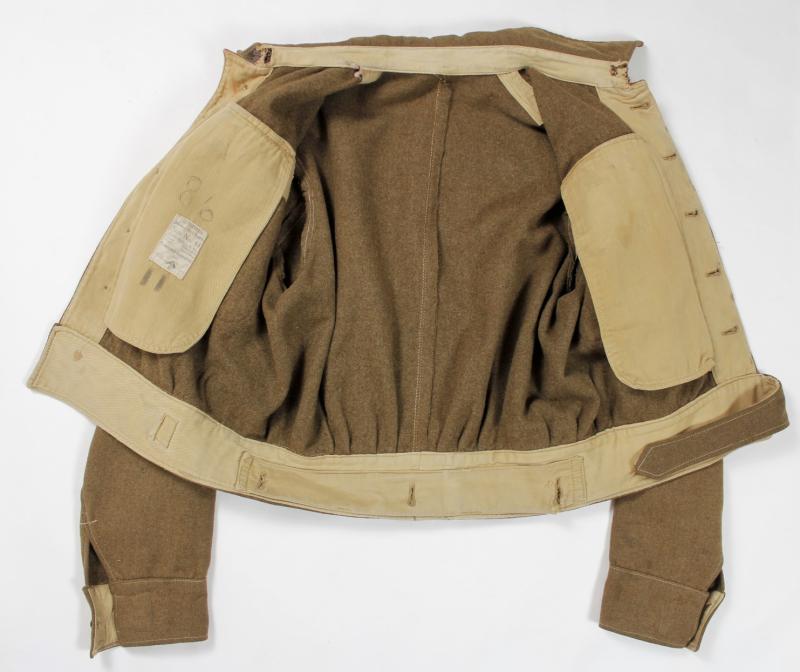 A WW2 British battledress with pleated pockets, brass dished buttons & lined collar complete with 1942 dated label.