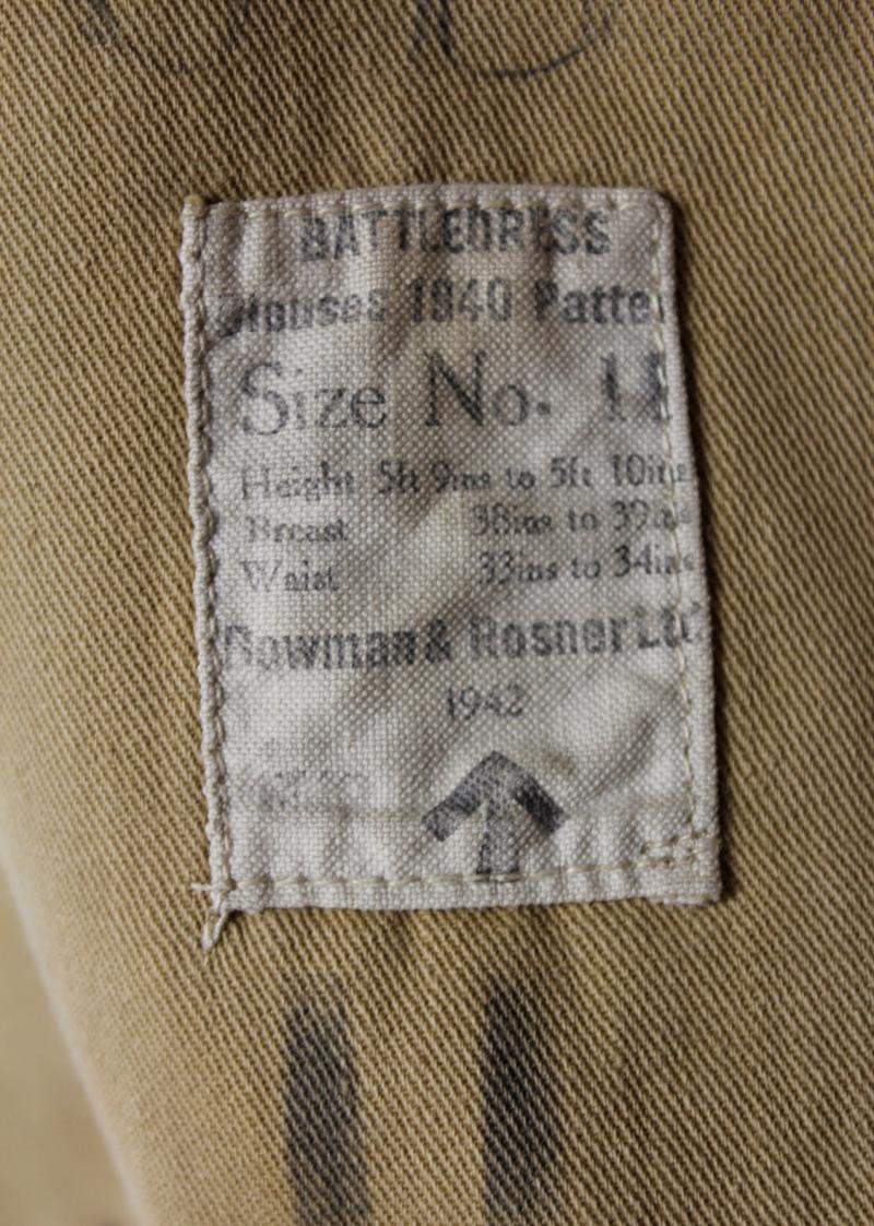All of its cuff , front fly & pocket buttons are still present. Clothing label sewn to inside lining reads ' Battledress, Blouses 1940 Pattern Size No.11' Made by Bowman & Rosner Ltd with broad arrow mark & clear 1942 date. The 'O' coded ( 1942) WD inspectors stamp can be faintly seen on the lining with faint remains of an 'Anti Vessicant' treatment stamp also partially visible. In overall good service worn condition with wear to nap of the cloth & an insignia removed example .