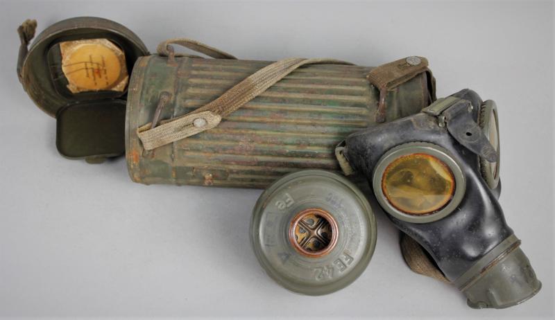 Originally issued in its factory green paint the canister has been handbrush overpainted in a matt khaki green with dabs of the typical forest green & reddish brown applied ad hoc over it. To the spare lense compartment is the maker & date 'ebu42' with one packet of spare lenses inside. Both long & short carrying straps are totally original to the tin & were found in situ. Gas mask is of the black rubberised M38 model with '38' date to snout . The Fe42 filter has an intact eagle & swastika marking with '42' date & 'fcc' maker code. A part of the front pull strap has come away due to age but still a rare camouflage item & 100% original from the W Europe fighting.