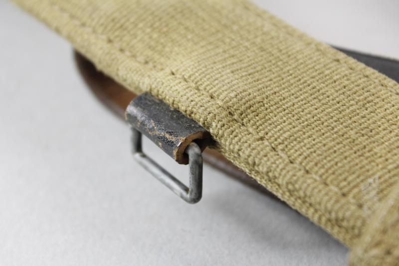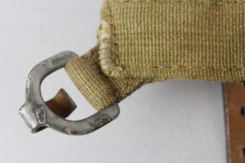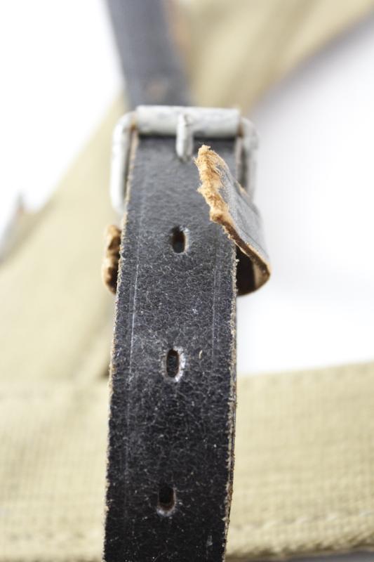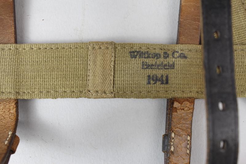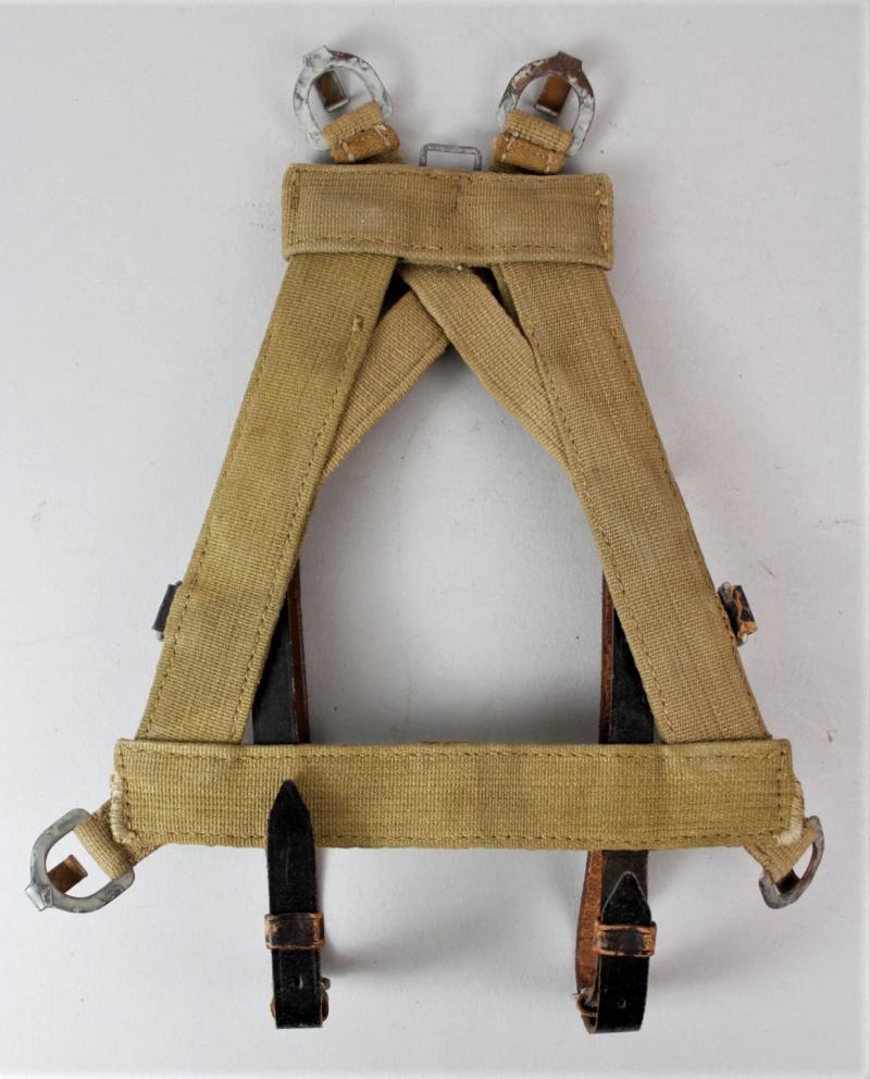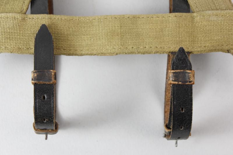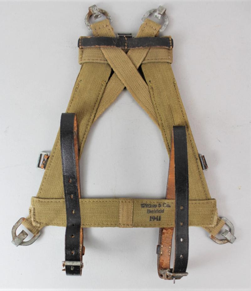 This webbed 'A frame' has black leather straps & is maker stamped to a Bielefeld company with 1941 date. Many variations exist however this piece is of the classic textbook standard. Internal cowhide stiffeners visible. The leather is overall good however one of the strap keepers has opened at one end & the leather has weakened near to the buckle end on one side. Still perfectly fine for strapping in a zeltbahn etc & for mannequin display.