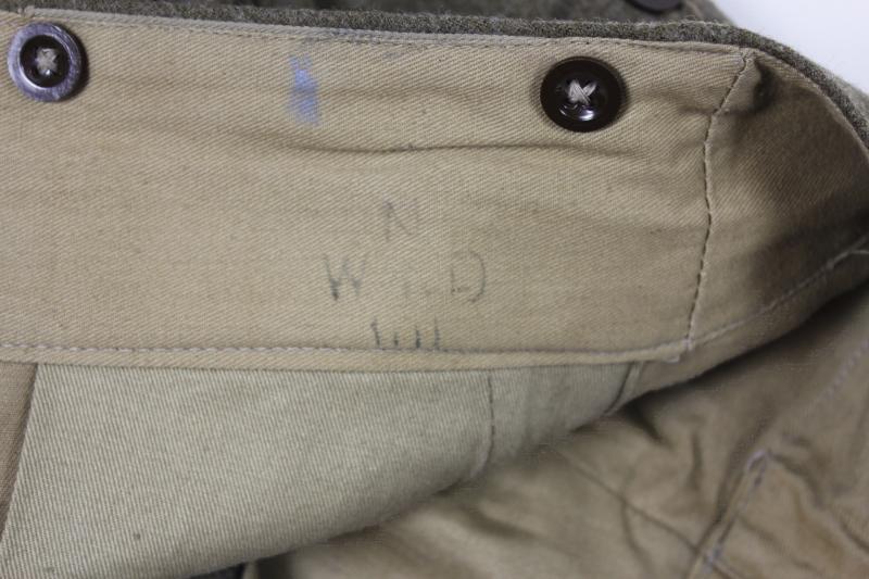 In excellent condition it is very hard to find BD trousers still with their dated clothing label present. An 'N' coded WD inspectors stamp can be seen to the interior waistband . Upon very close inspection only two very small moth nips can be found to the wool .