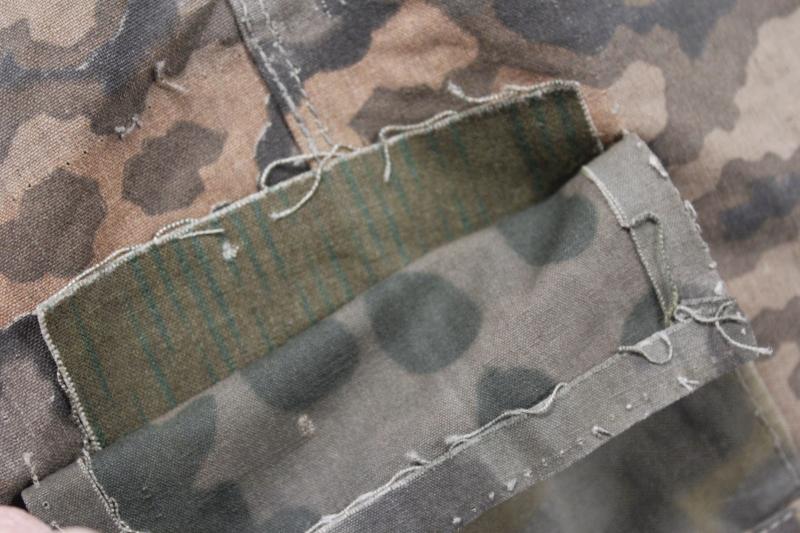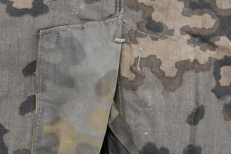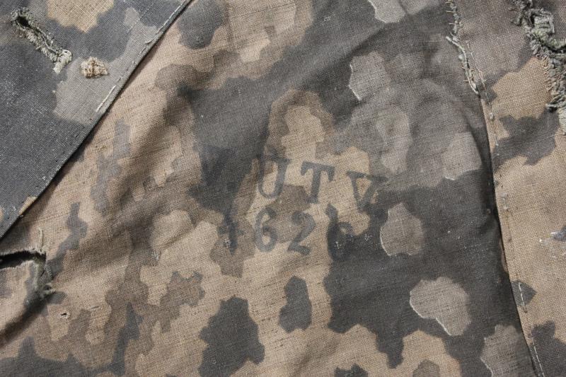 A heavily used SS zeltbahn in Oak Leaf A camouflage with some elements of Plane Tree used in its head opening section. This machine rolled pattern was in use by 1943 with production continuing right through until 1945. With some rips & tears & a mixture of buttons , some 'French Militaire' which indicate use by a French soldier at some point either during or after 1945. In one corner is a black ink stamped marking ' V.U.T.V. 4620 ' . Stitching away in areas although enables the internal construction to be viewed on the eyelet reinforcement with a piece of splinter material inserted.