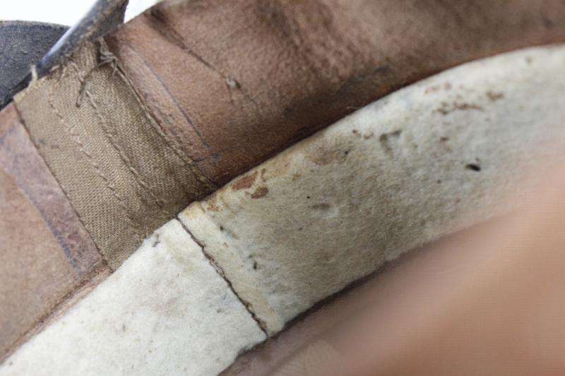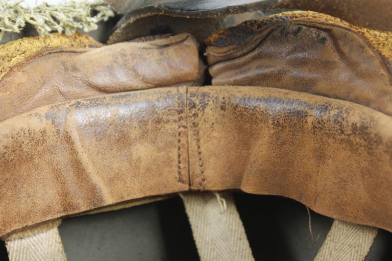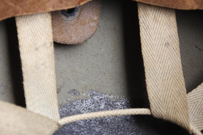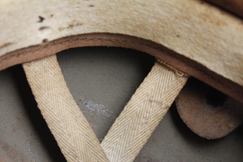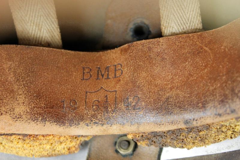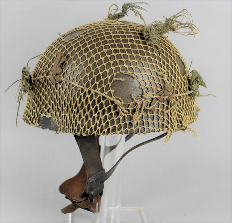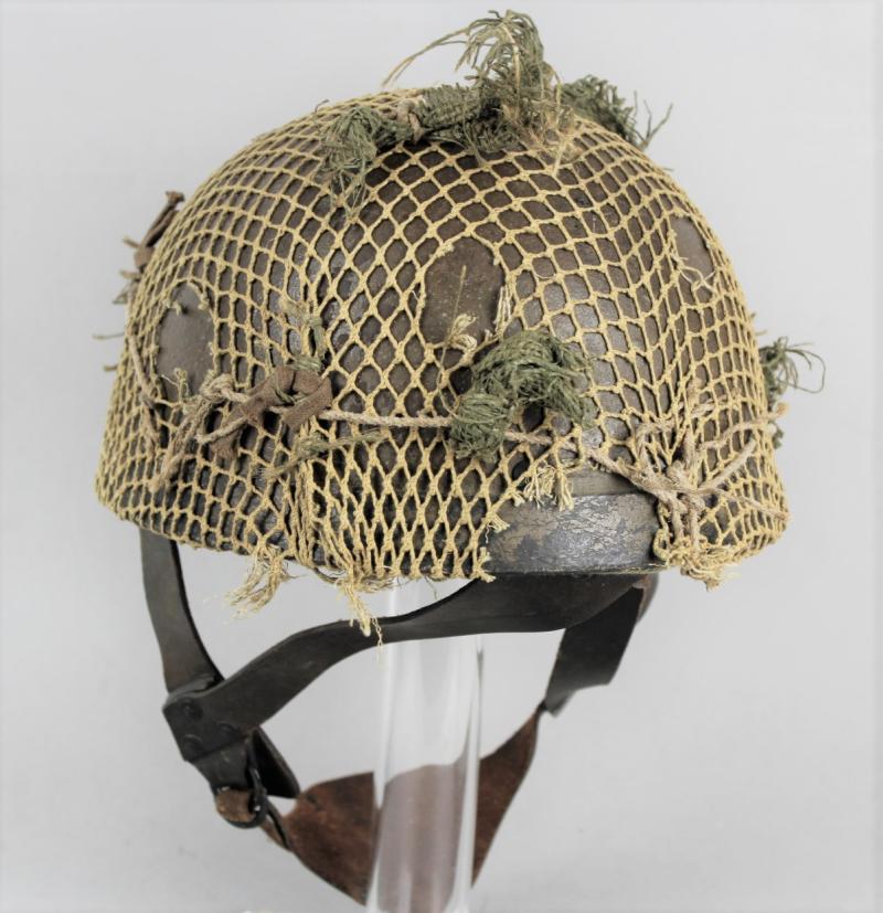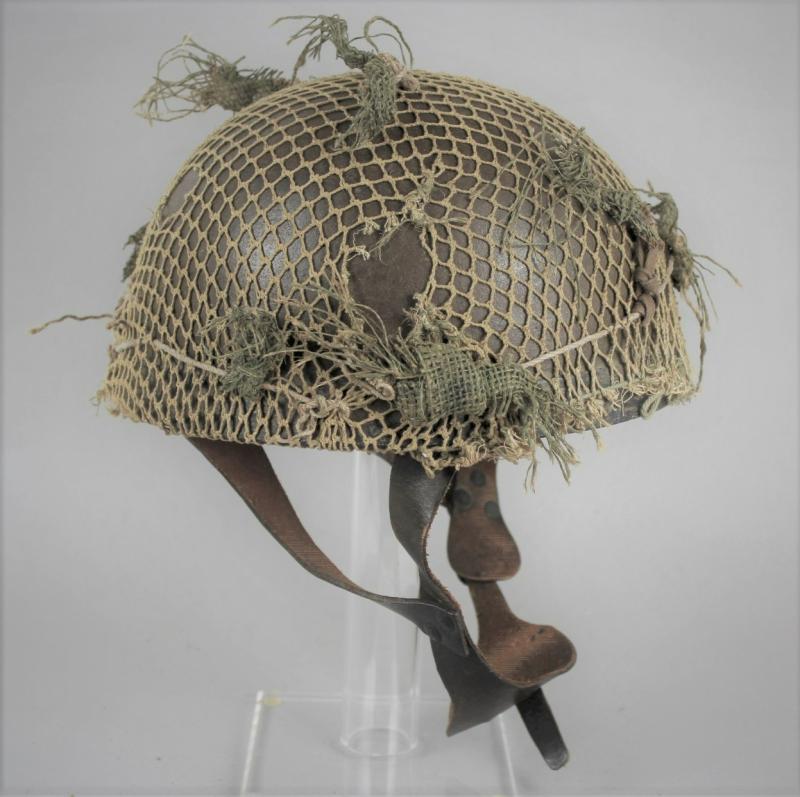 This helmet was produced as of June 1942 up until October of that same year & so only had a limited production run until it was replaced by later models. Still in use right through WW2 early Airborne troops wore this model in North Africa & Italy then Normandy & Arnhem alongside later slightly remodelled examples. A helmet that could clearly tell a story this fabulous piece of Airborne history retains a high proportion of its original khaki rough textured paint to inside & out with fibre rim band still firmly in place . Interior of helmet has riveted chinstraps with yellow sorbo pads remaining in very good supple condition. The leather headband is marked 'BMB' with size 6 1/2 & date '1942' . Covered with a scrim camouflage net this has been tied around the rim & I have made no attempt to remove it .