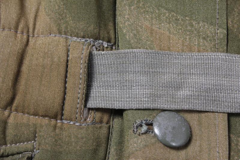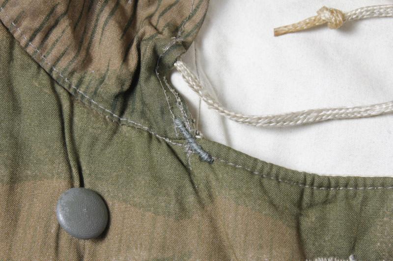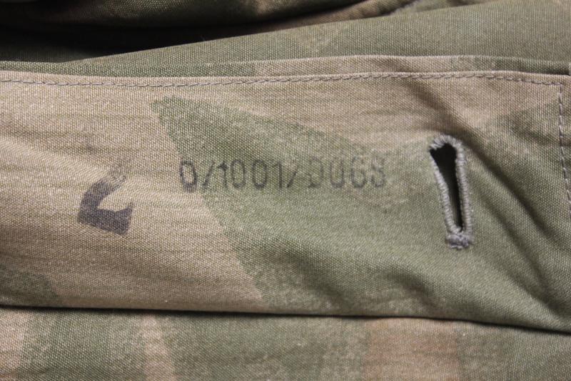All of its grey/green painted pebbled buttons are still present to front fly & also white reverse side with rayon green to white waist tie intact. Each sleeve still have their two pressed card buttons for fitment of the identification armband. Each adjustable cuff still has its tightening tab & two buttons with tightening cord also to hood & lower hem . The wind flap is ink stamped with RB Number & what appears to be size '2'. Condition wise it is excellent with only one small 5cm patch repair to upper back .