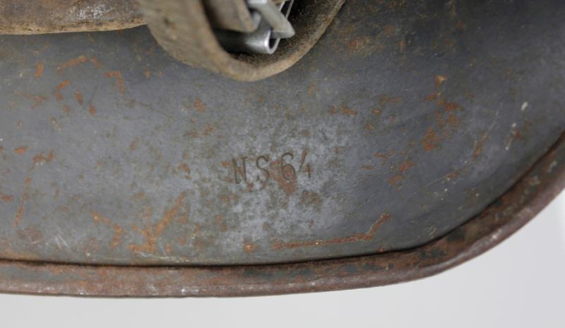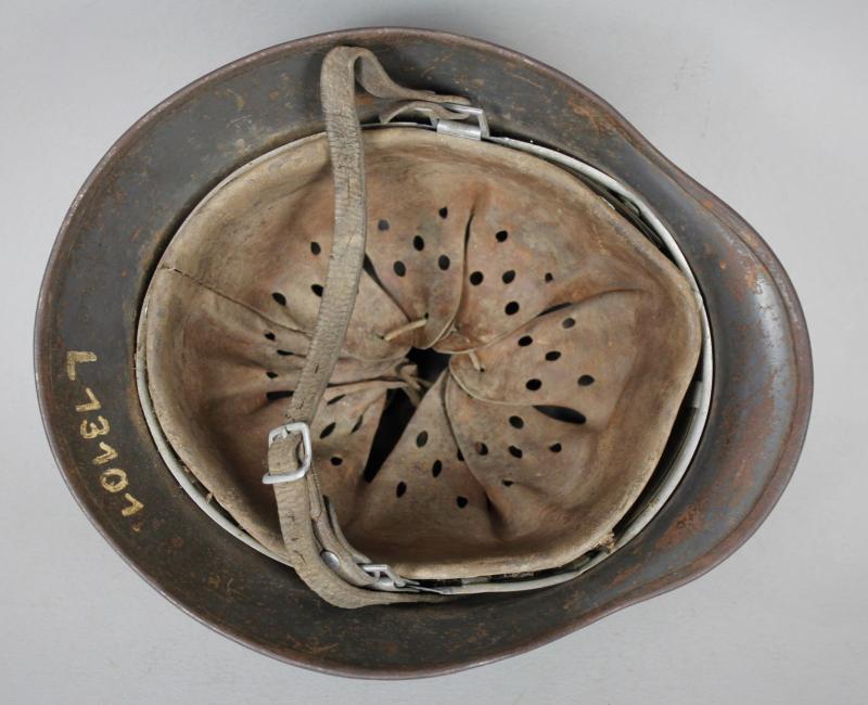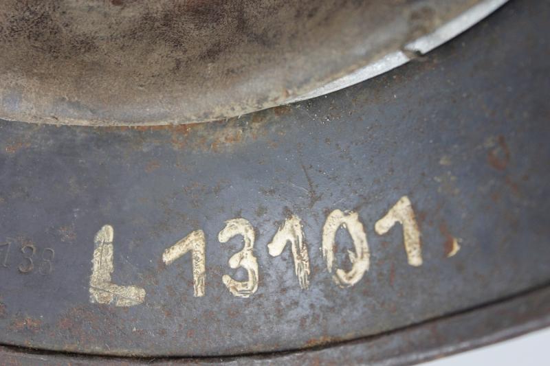 Still bearing its tricolour national shield the second pattern eagle is faint on the left side due to extensive wear. Its early factory painted dark blue/ grey is much evident to its entirety with minor surface chips & scuffs from heavy wear. All three of the liner pins are original & undisturbed . Underside of the helmets rim shows maker mark' NS64' with lot number 'E138' .The leather liner is totally uncleaned & left as it was found with the original drawstring allowing us to see the unit ink stamp to underside of the leather. The German Feldpost number of 'L13101' has been painted to underside of rear rim. The brown leather chinstrap is its early issue with LBA inspection mark ( Luftwaffe Bekleidungs Amt ) & the remains of a unit mark also . Buckle is of aluminium.