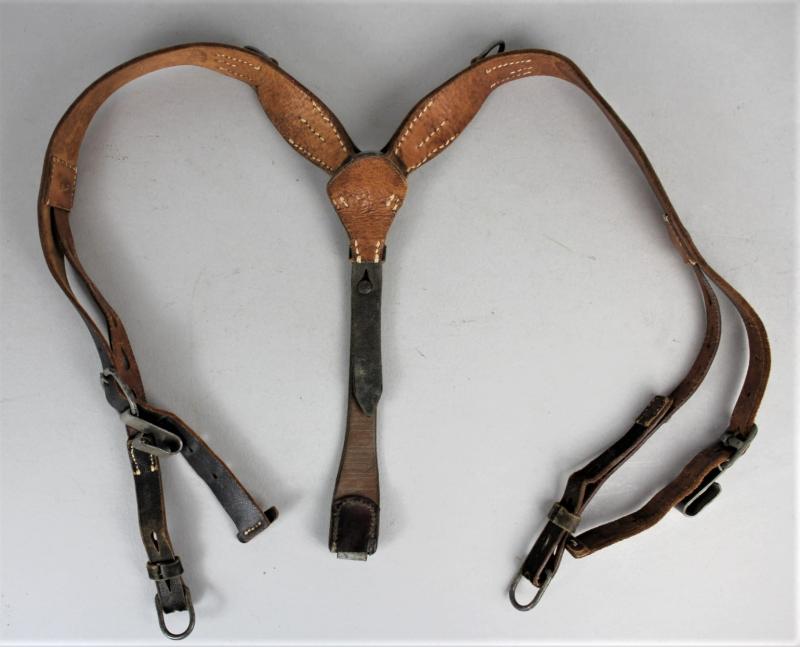 A pair of the M39 standard issue Y straps in a mix of brown & black leather with maker mark & date ' FRANZ BREHME,WALSRODE, 1942 ' . Grey painted steel fittings & good supple leather with no damage.
