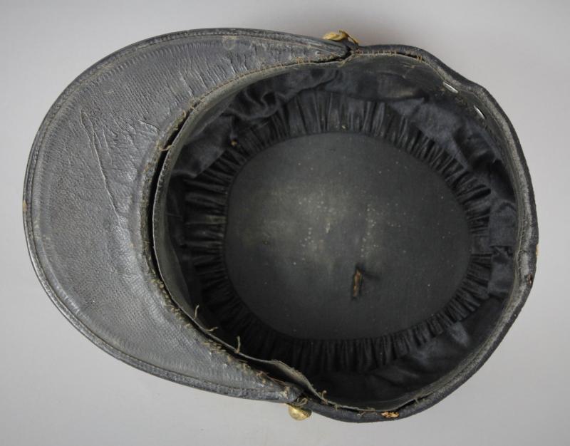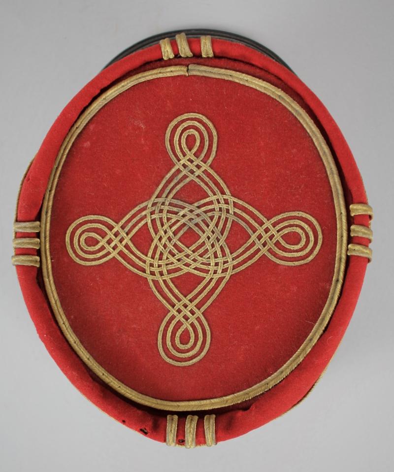 In the wartime 'Polo' style this fashionable shape began to be seen in the early stages of WW1. Lacking regimental numbers this high ranking officer would have been an Aide-de-Camp to a General or Minister therefore not affiliated to a specific regiment. With gold chinstrap & plain buttons the leather headband has some stitching minus in places & there are a few moth nips to wool in places.
