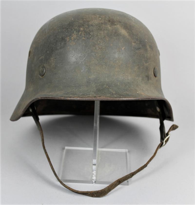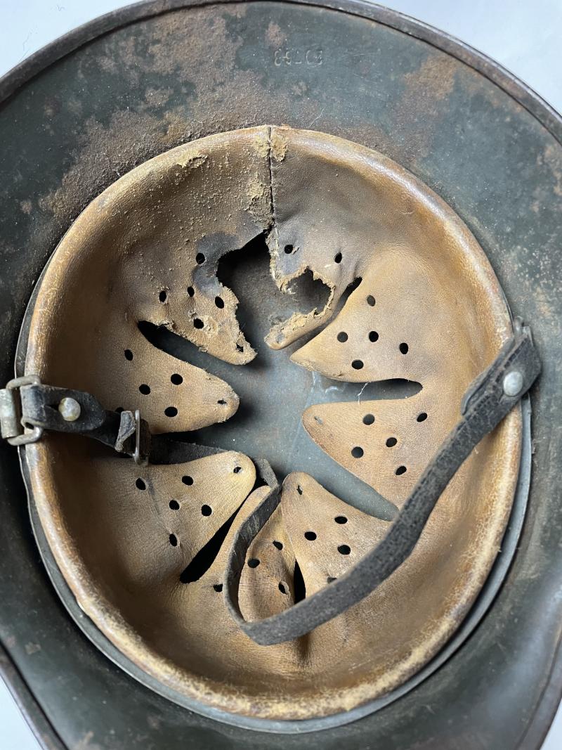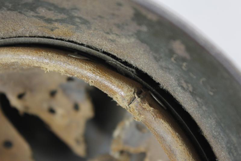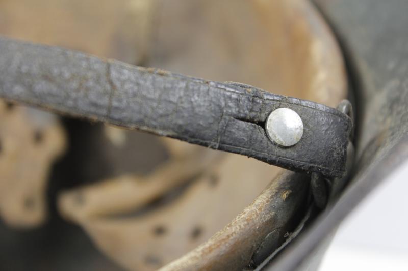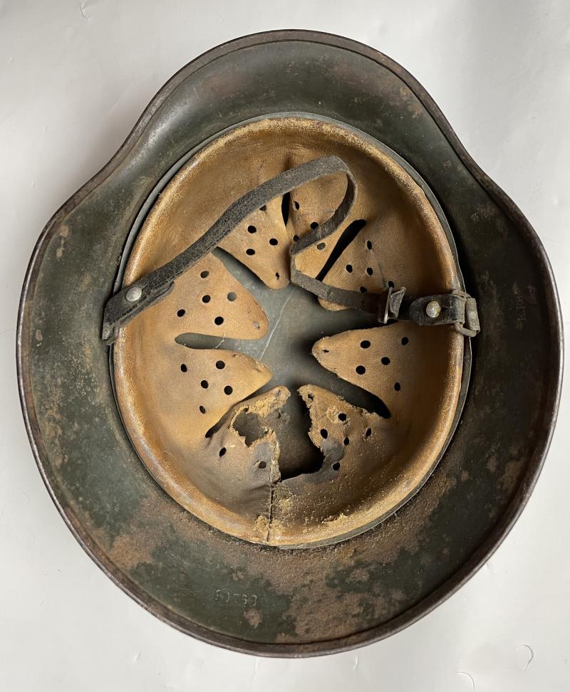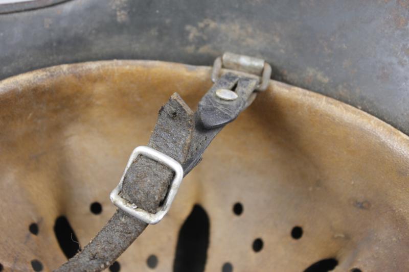 Another helmet that recently manifested itself after years of forgotten storage it is offered as it came to me uncleaned & uninterfered with straight from the war. It would appear that it was refinished fairly late in the war or after the end of decal usage in 1943 as both decals are painted over . The underside of the helmet shell remains in its original M35 smooth paint. There is some age to the helmets underside & a small part of the leather liner which is dark stained & decayed. Chinstrap remains intact & interesting to note that the soldier has trimmed it slightly on its long section & shortened the pointed end to suit his own fit . This is not uncommon & totally period done as can be seen from a minimal inspection.