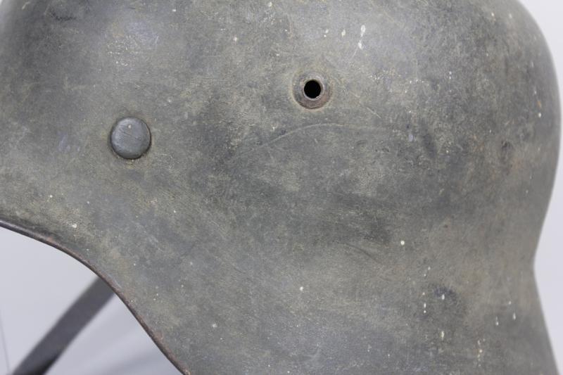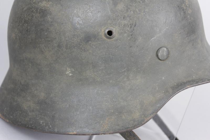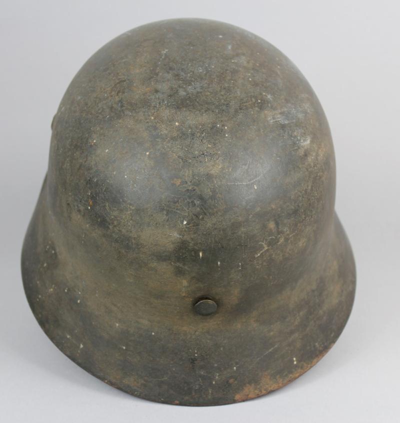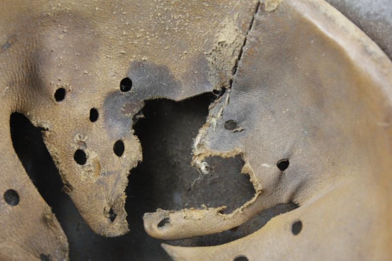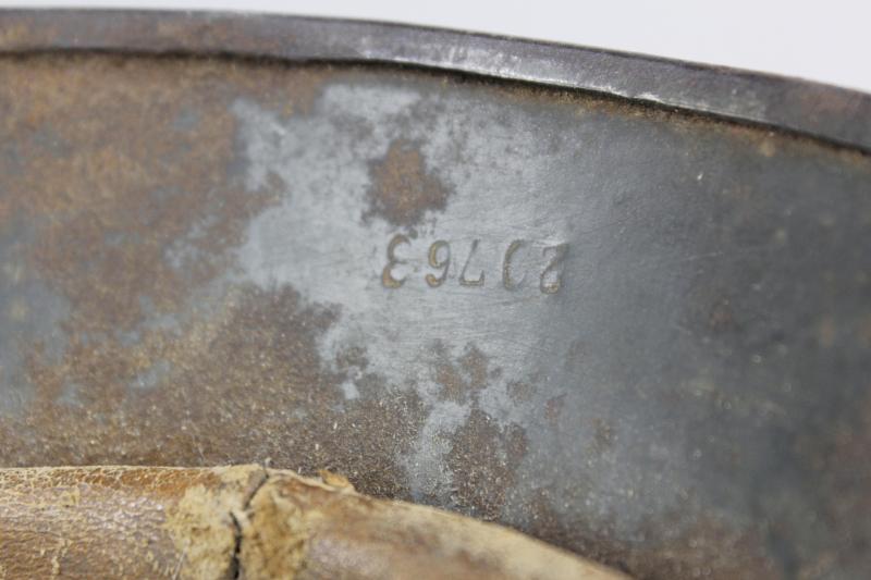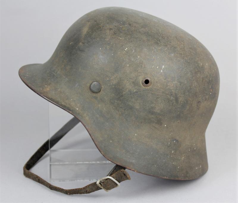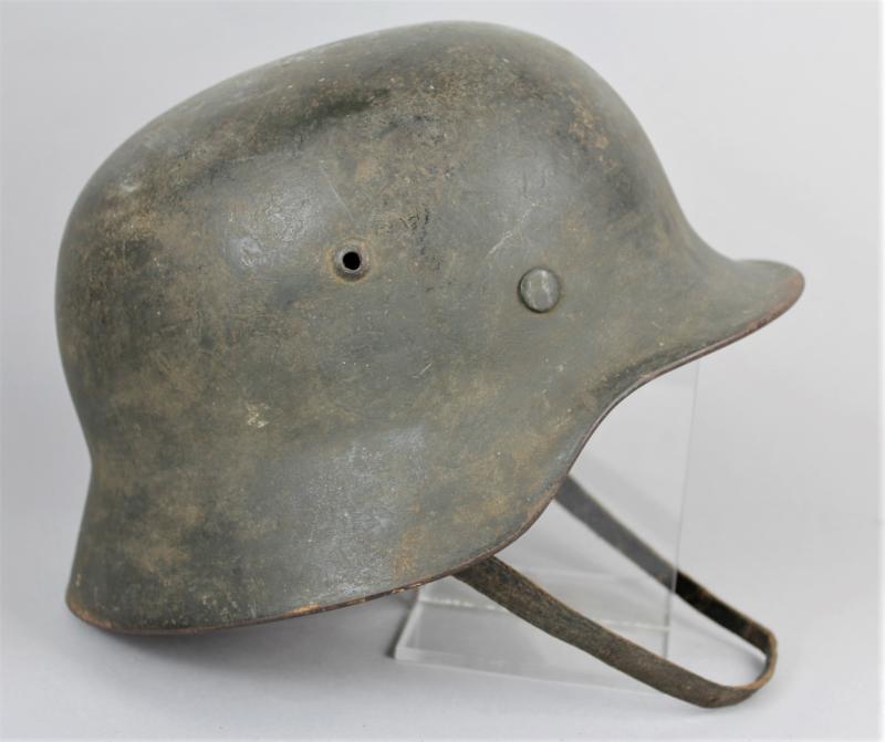 Another helmet that recently manifested itself after years of forgotten storage it is offered as it came to me uncleaned & uninterfered with straight from the war. It would appear that it was refinished fairly late in the war or after the end of decal usage in 1943 as both decals are painted over . The underside of the helmet shell remains in its original M35 smooth paint. There is some age to the helmets underside & a small part of the leather liner which is dark stained & decayed. Chinstrap remains intact & interesting to note that the soldier has trimmed it slightly on its long section & shortened the pointed end to suit his own fit . This is not uncommon & totally period done as can be seen from a minimal inspection.