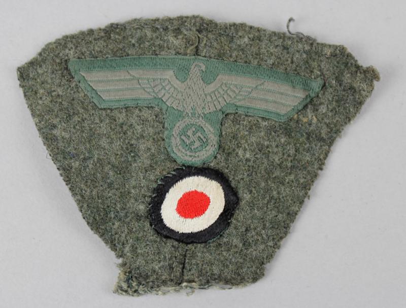 A cut off eagle & cockade from an M43 cap showing HBT stiffener to rear which would normally hidden by the lining.