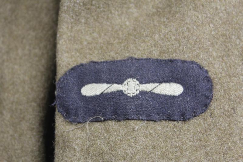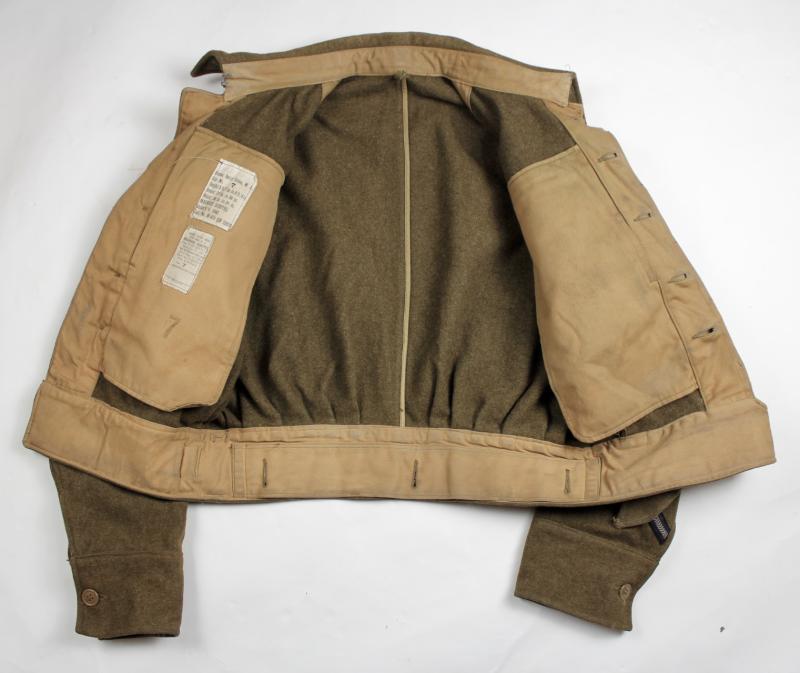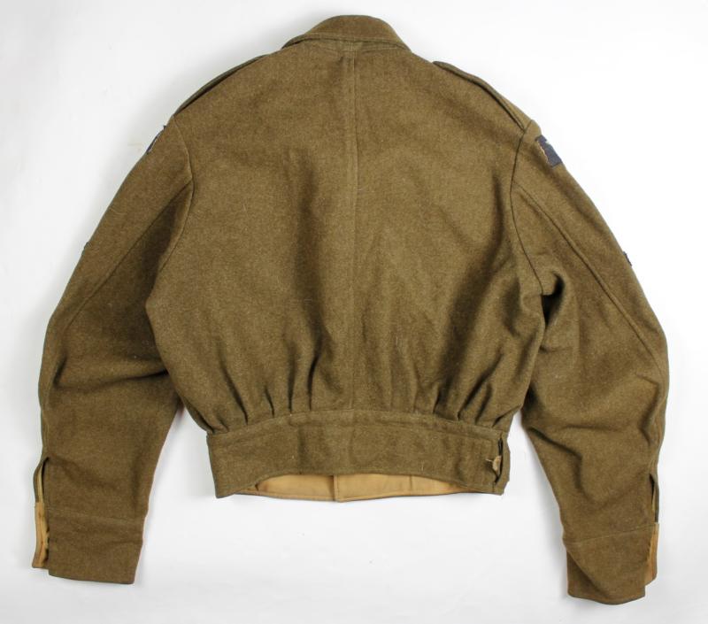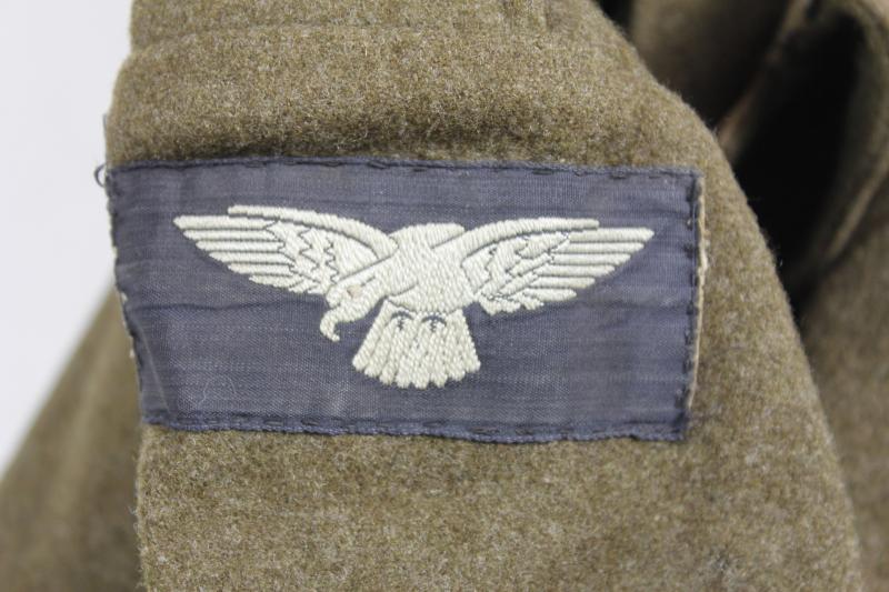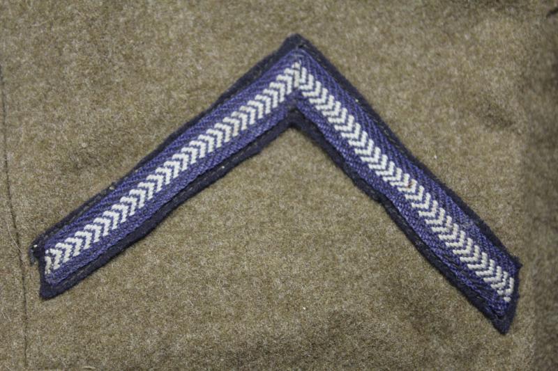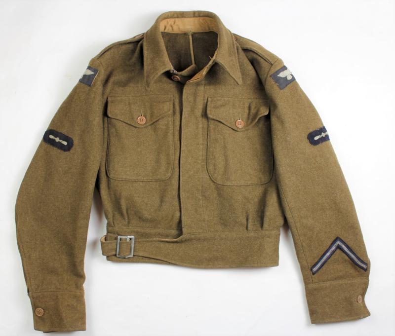 A totally original badged RAF battledress blouse in the normal colour issued to the army but with blue RAF insignia . These were commonly worn by RAF personnel serving with the 2nd Tactical Air Force in NW Europe the blue issues being more conspicuous than their khaki counterparts.