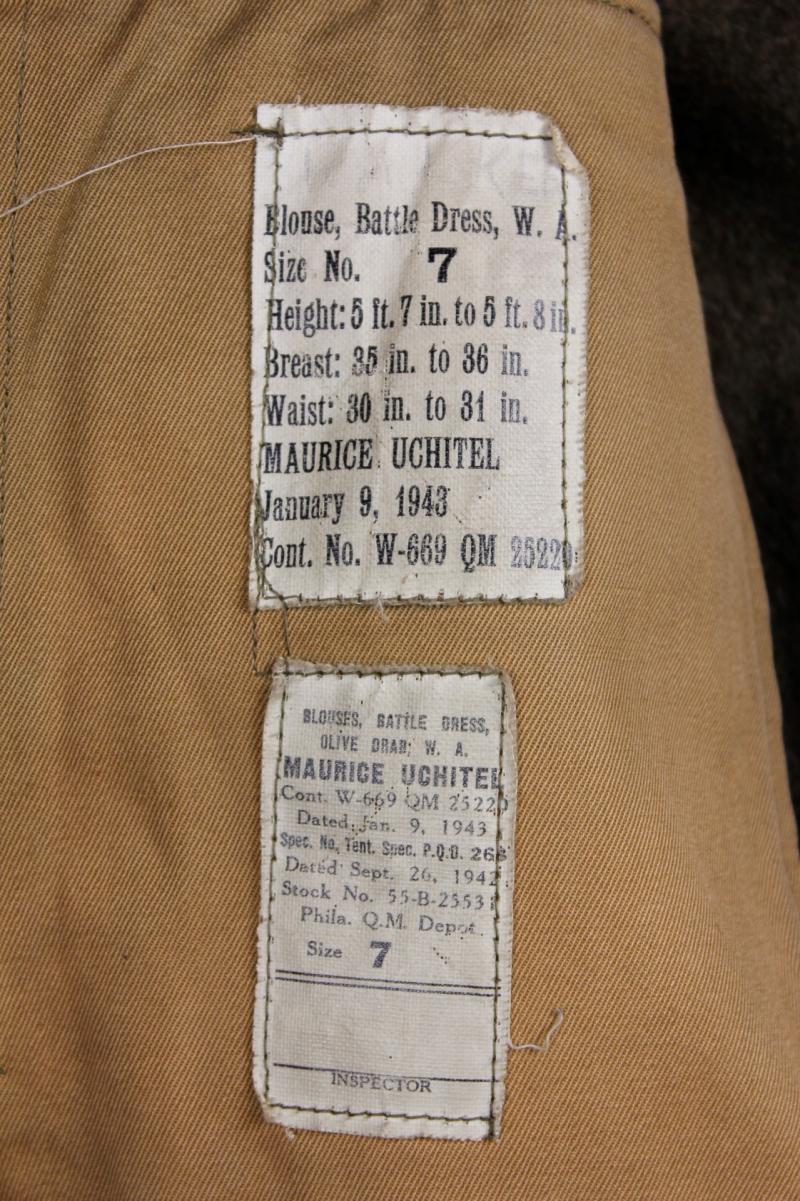 Blouse is an American made 'War Aid' example these were supplied to Great Britain under the Lend Lease agreement along with many other items of clothing , weapons & equipment. The clothing label gives a contract date of January 1943. Bearing the rank of a Leading Aircraftsman there is also one Good Conduct stripe to left sleeve.