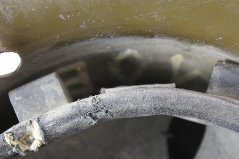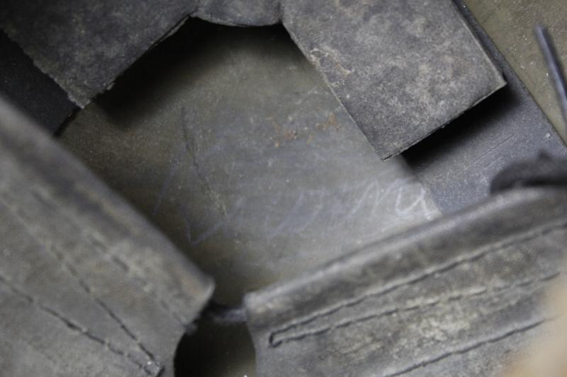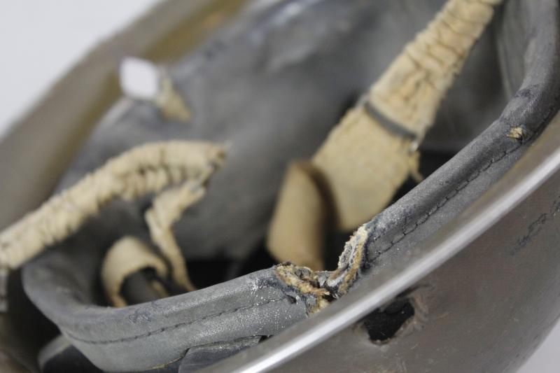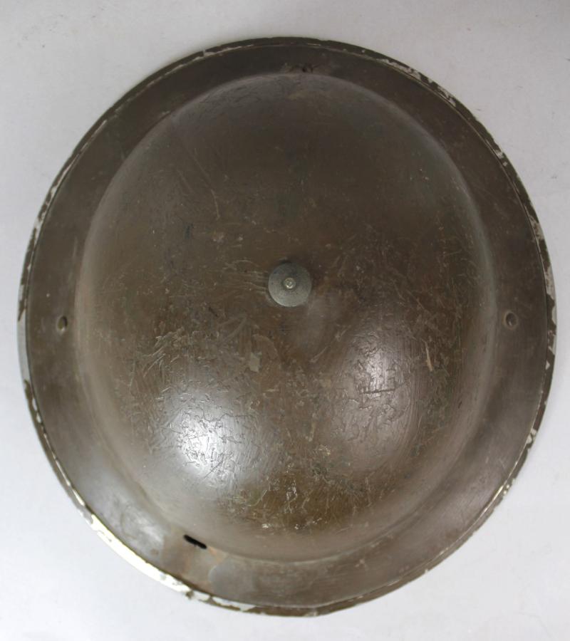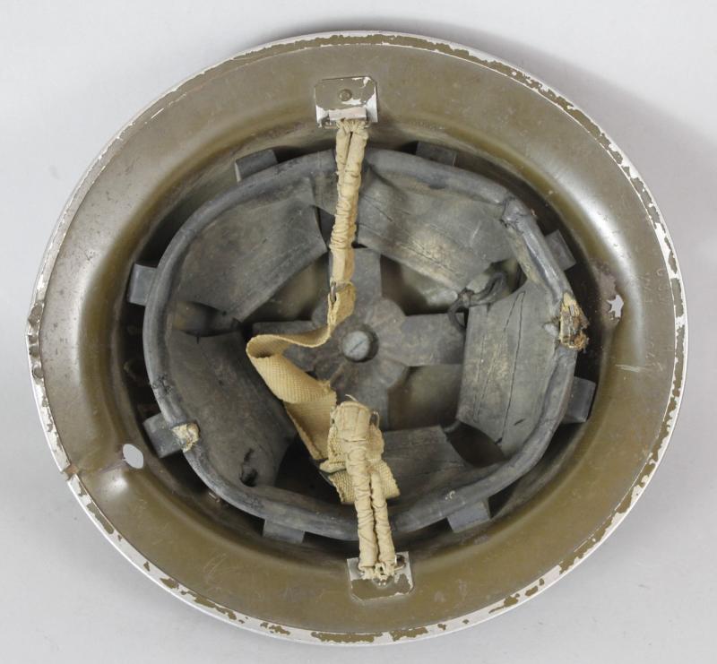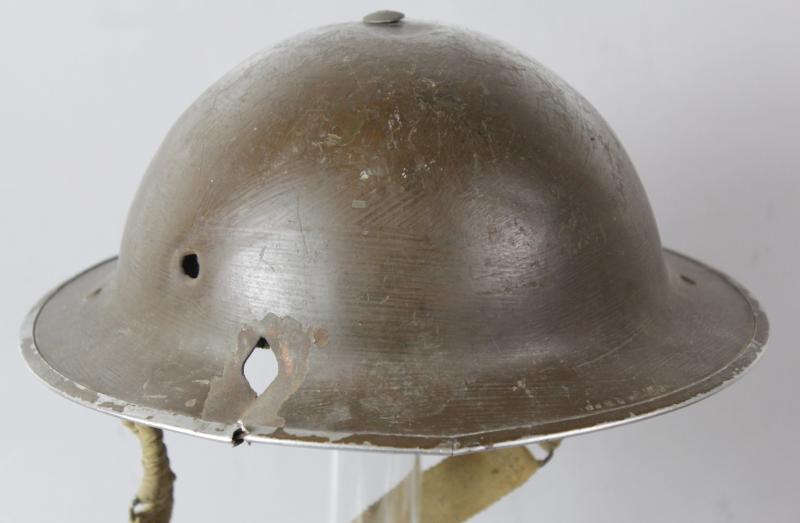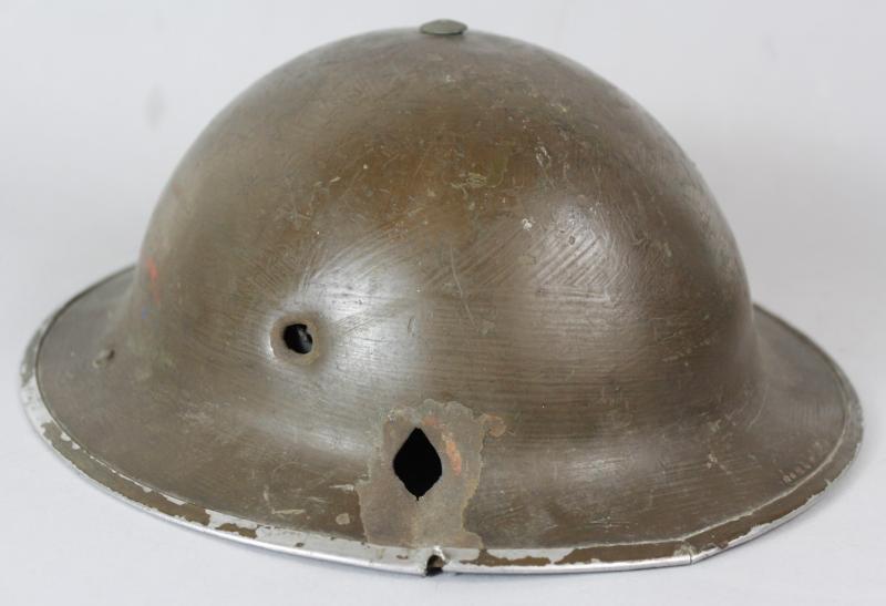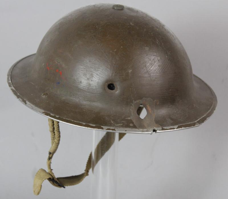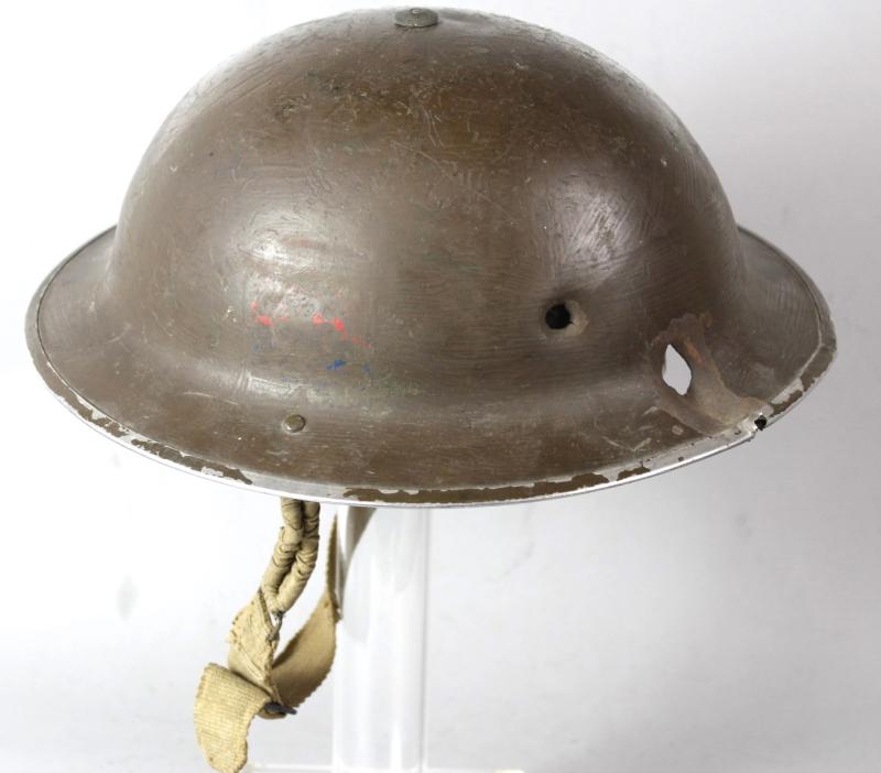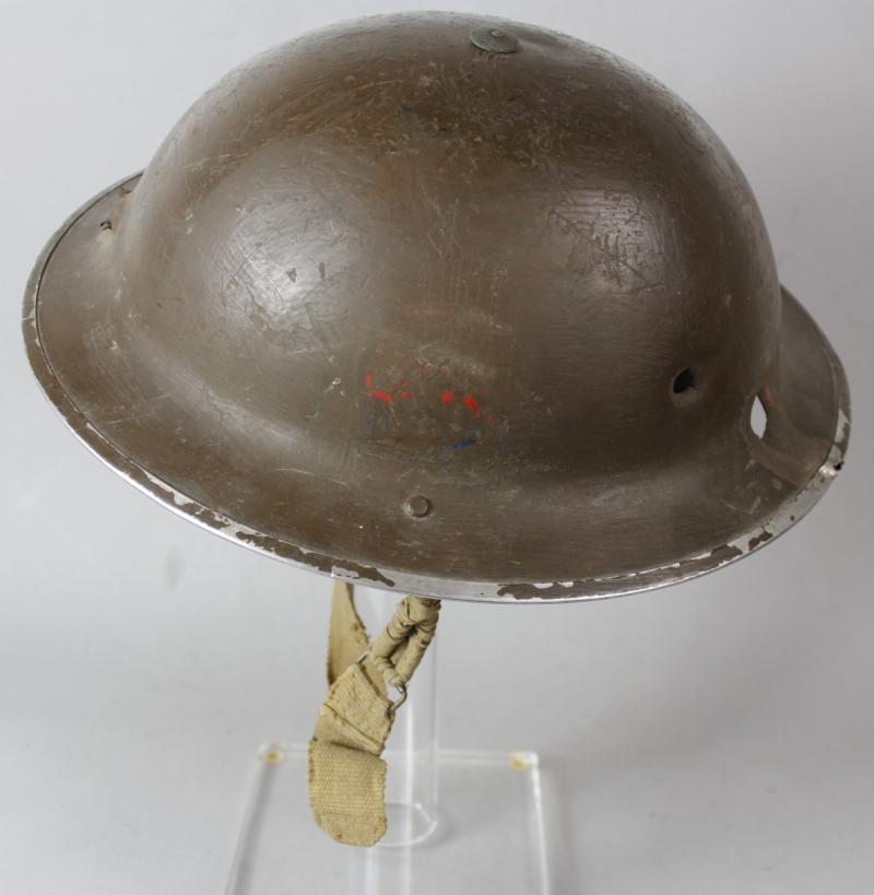 A souvenir of the Normandy campaign this Canadian MkII helmet has remains of a red & blue flash for Artillery to left side & bullet damage to front & back. There is also a name & some initials written to underside of shell which may be dechpierbale upon closer examination.