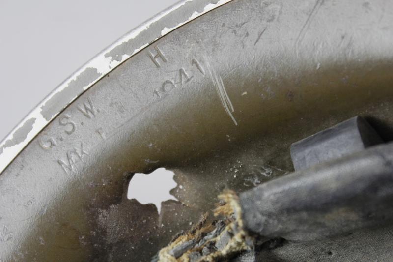 Helmet has a very typically Canadian thick dark brown handpainted overcoat to exterior with the Canadian green factory finish still visible to underside & interior. Remnants of the red & blue colours of the Artillery are just about still visible with two bullets having entered the helmet from the rear with one having travelled through & across the liner before exiting through the front . The second bullet appears to have entered at a higher trajectory so has exited down & out of the inside. Helmet has markings to its shell underside of ' GSW ' for the firm 'General Steel Wares' with date 1941. Liner is marked 'VMC' for 'Viceroy Manufacturing Company' & dated 1942 . Webbing chinstrap is a British issue but exactly how the helmet came.