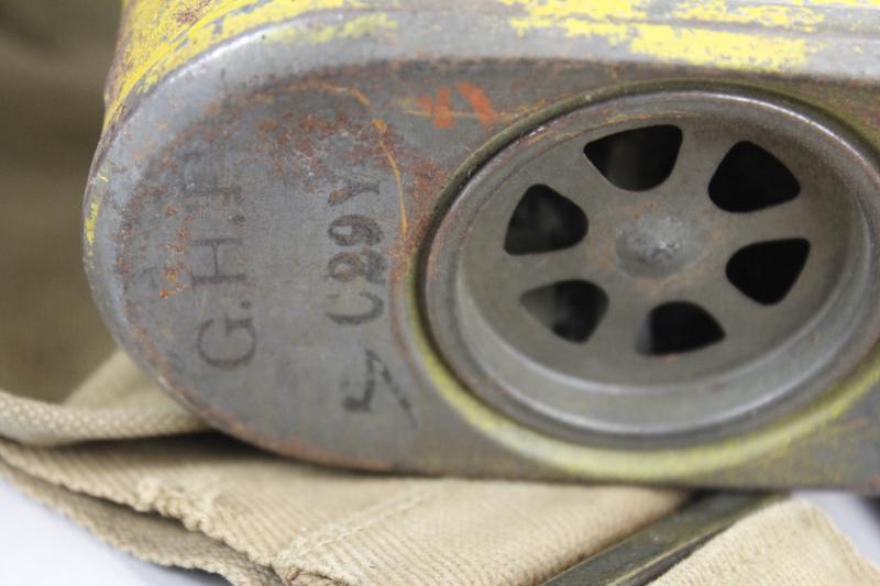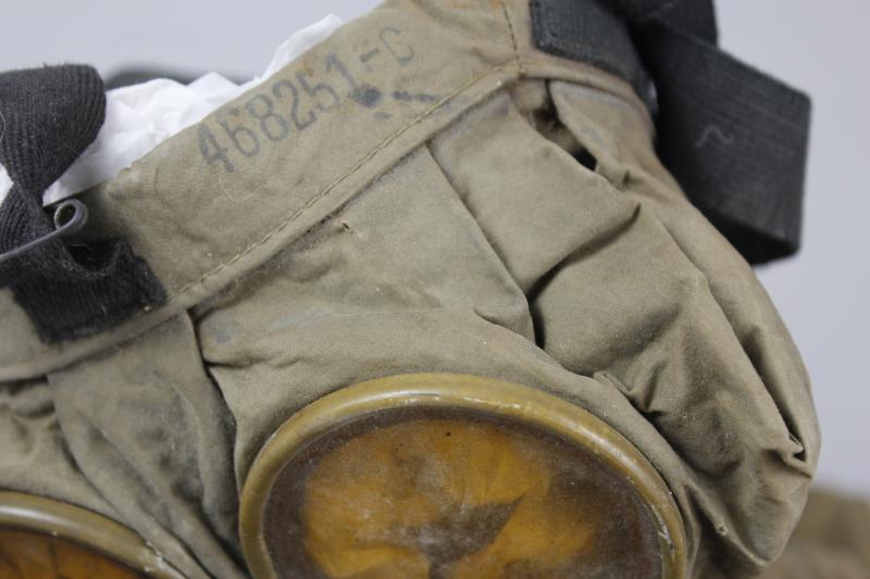Facepiece is of rubberised fabric with tan khaki hose & yellow US issue painted & numbered filter.