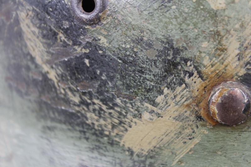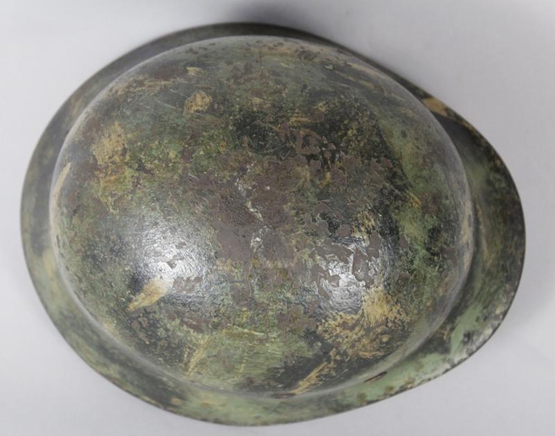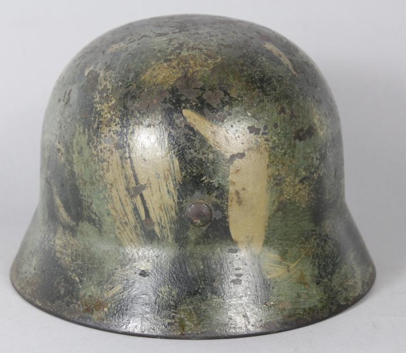 A WW2 German Luftwaffe camouflage helmet having received a dark green overpaint to the Luftwaffe blue with tan ochre & light green brush strokes applied 'ad hoc' to the exterior.
