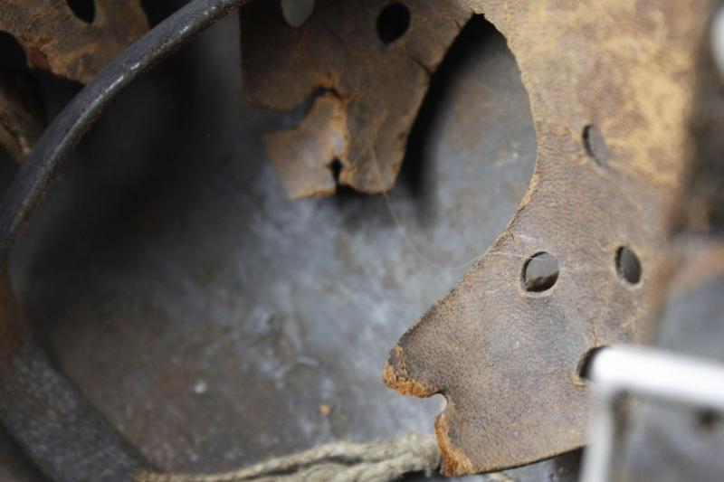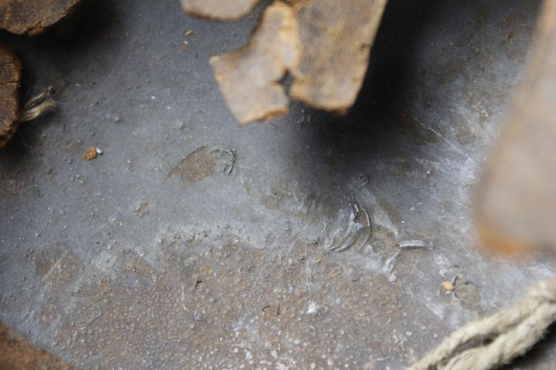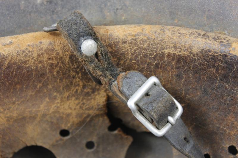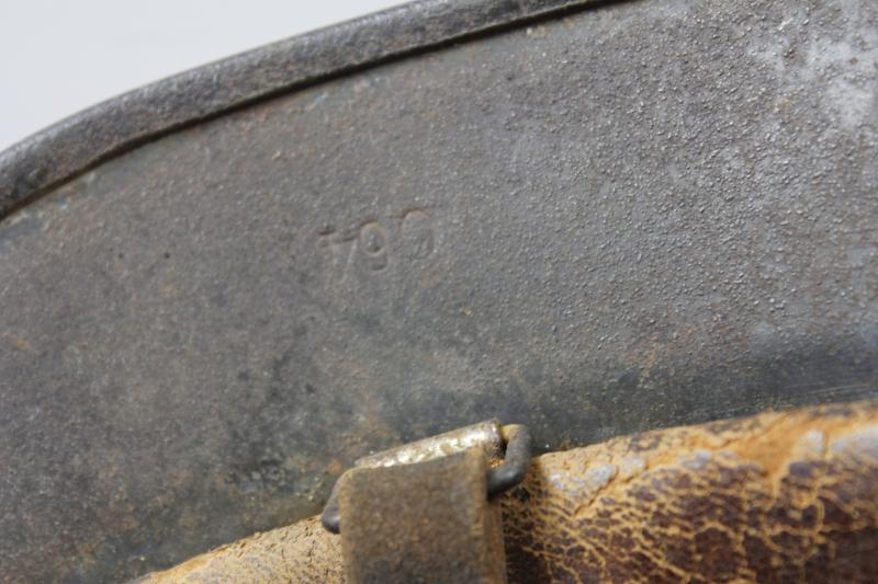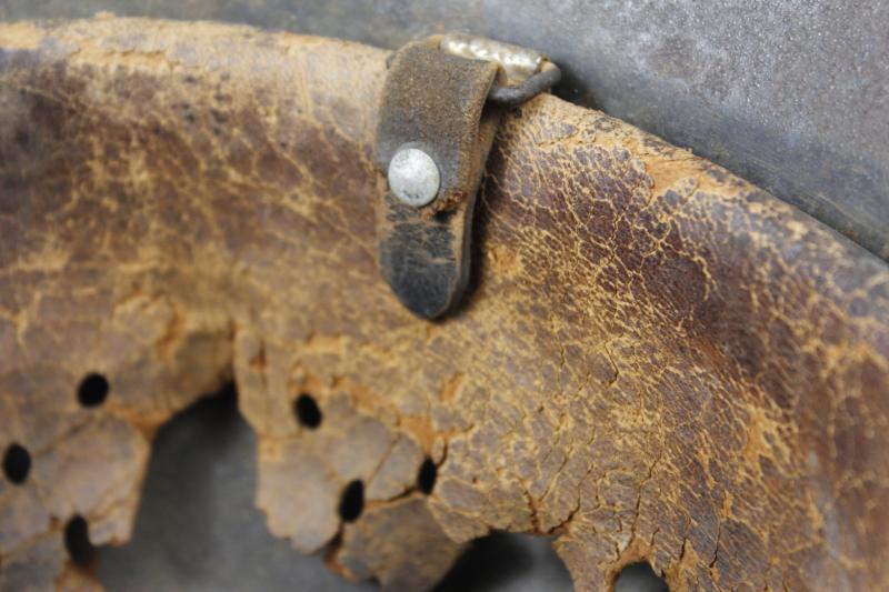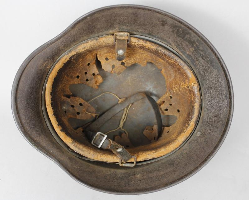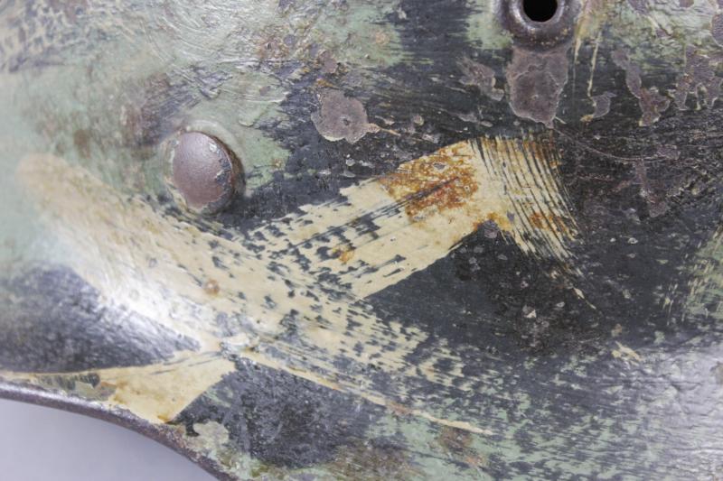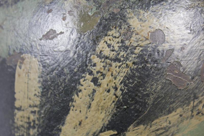 A helmet that has seen heavy wear its original blue factory paint can still be seen to interior dome. This type of camouflage scheme is indicative of a ground combat Luftwaffe soldier fighting in a Field Division /Paratrooper unit or ground combat gun crew. All three liner pins are undisturbed & have not been out of the helmet. Made by Quist , the marking 'Q64' is visible to underside of shell although lot number illegible. Leather liner is very heavily worn & shows age , please see images. Remains of chinstrap to each side.