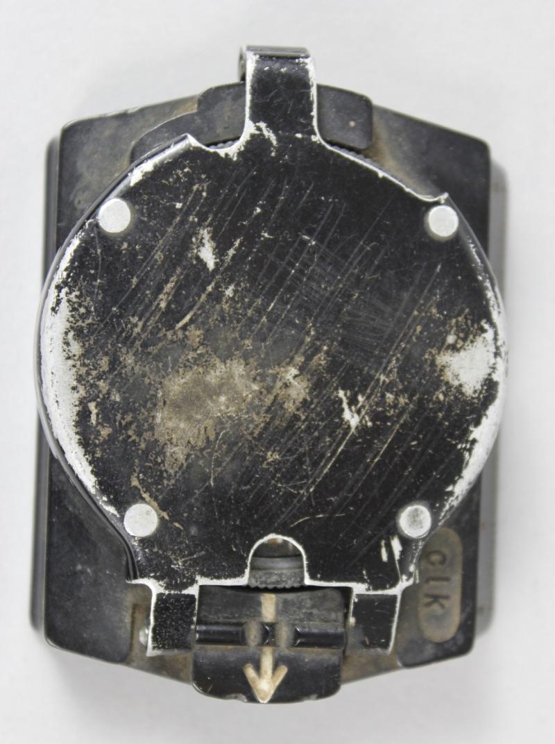 German marching compass with bakelite bottom & metal hinged lid. Manufacturer marked 'clk' & in good used condition.
