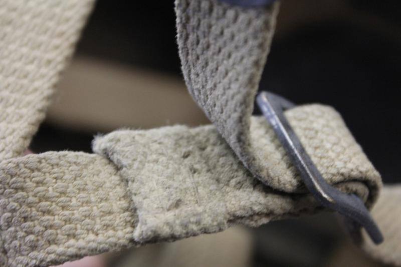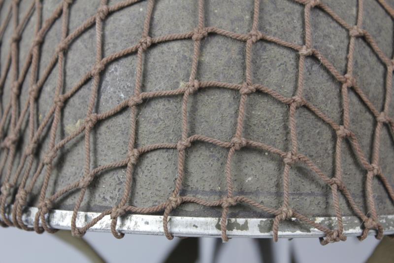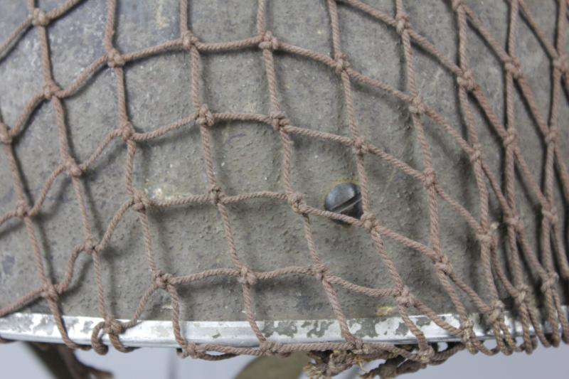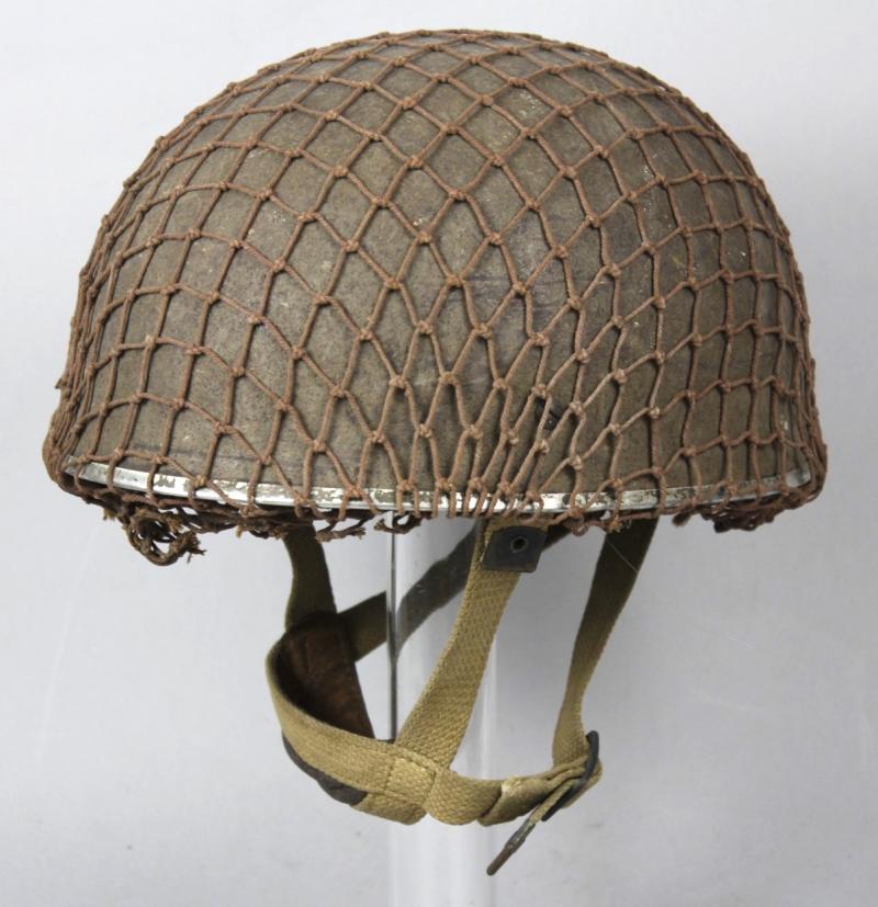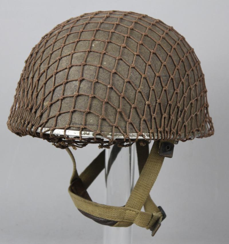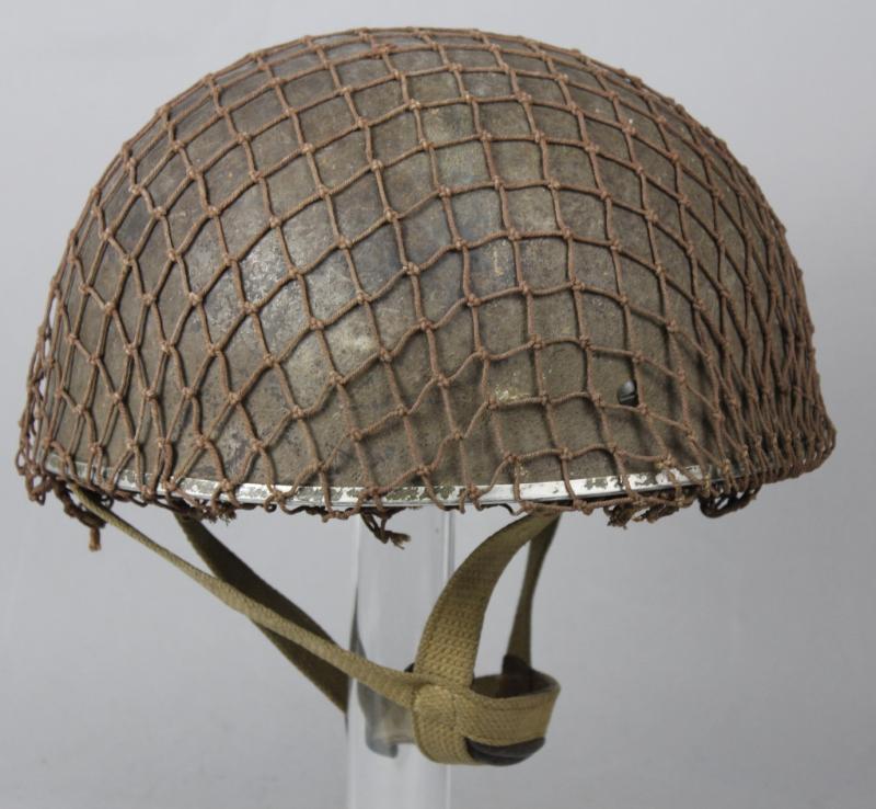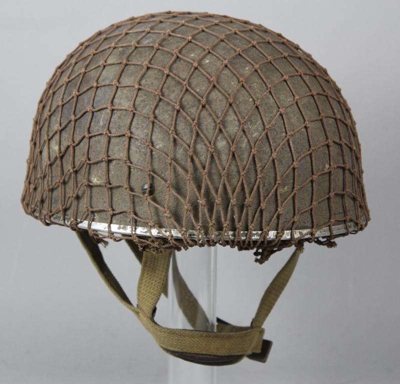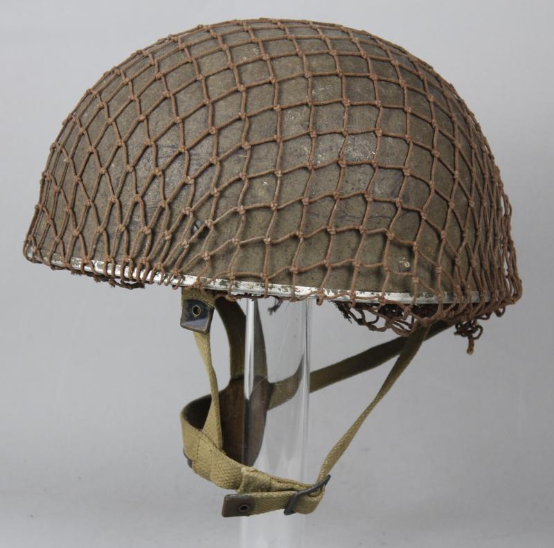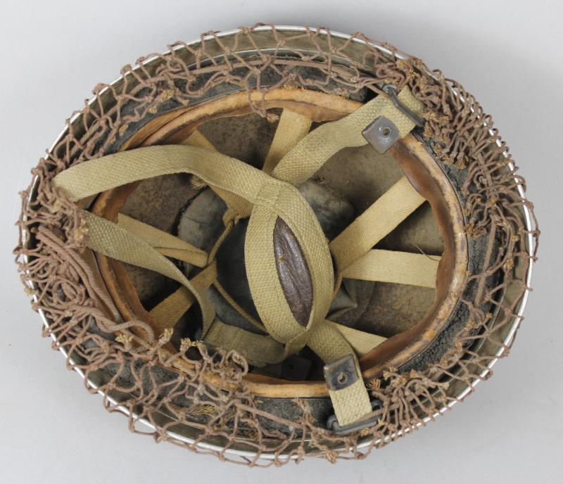 Helmet has its original wartime green factory paint to shell with correct wartime camouflage net applied over the top. Paint shows heavy wear in areas with liner system still tight to interior & never having been out. Webbing straps shows the wartime stitch configuration which is explained in the superb reference by Oliver Lock ' British Airborne Headdress ' . Chincup complete with chamois leather lining. There is moderate wear to the leather headband however the date , maker & size of ' BMB 1944 7 1/2 ' is clearly visible. Dome crash pad still present to crown & rubber cushions all intact.